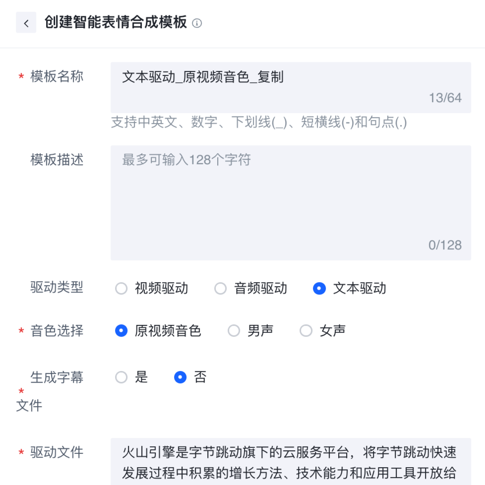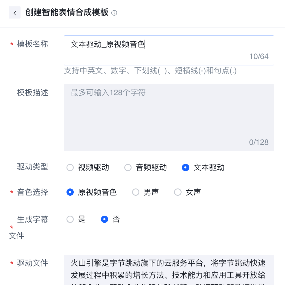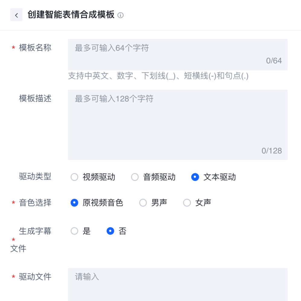 | 驱动类型 | 支持的选择:视频驱动、音频驱动、文本驱动,默认视频驱动。 |