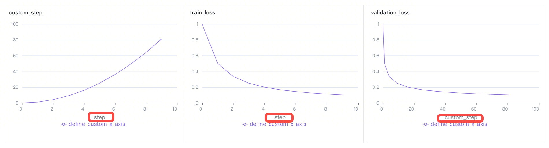 # define our custom x axis metric wandb.define_metric("custom_step") # define which metrics will be plotted against it wandb.define_metric("validation_loss", step_metric="custom_step") for i in range(10): log_dict = { "train_loss": 1/(i+1), "custom_step": i**2, "validation_loss": 1/(i+1) } wandb.log(log_dict)