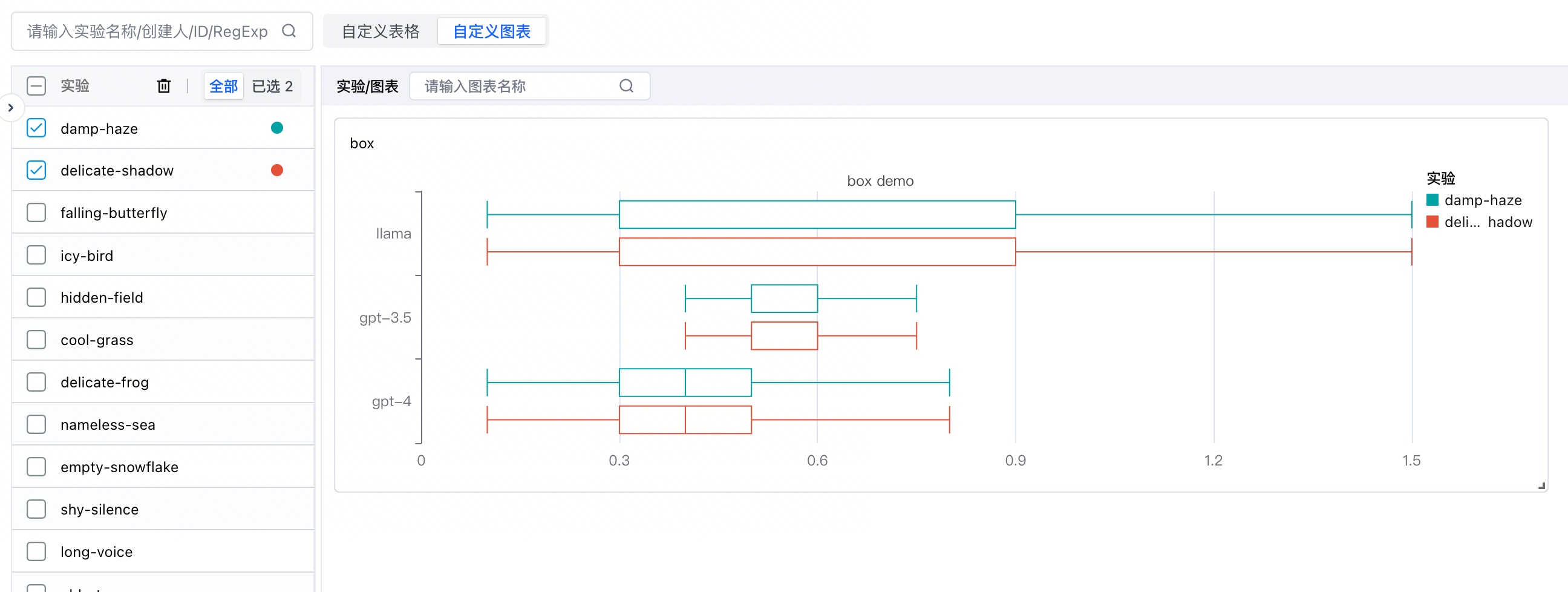 # define table data table = wandb.Table(data=[ ["a", 1.0, 0.8, 0.9], ["b", 0.5, 0.6, 0.9], ["c", 0.1, 0.6, 0.3], ["d", 0.3, 0.5, 1.5], ["e", 0.4, 0.4, 0.1], ], columns=["round", "gpt-4", "gpt-3.5", "llama"]) # define box columns and title box = wandb.plot.box( table, columns=["gpt-4", "gpt-3.5", "llama"], # 选择table中的哪些列作为数据输入 title="box demo", ) wandb.log({"box": box})