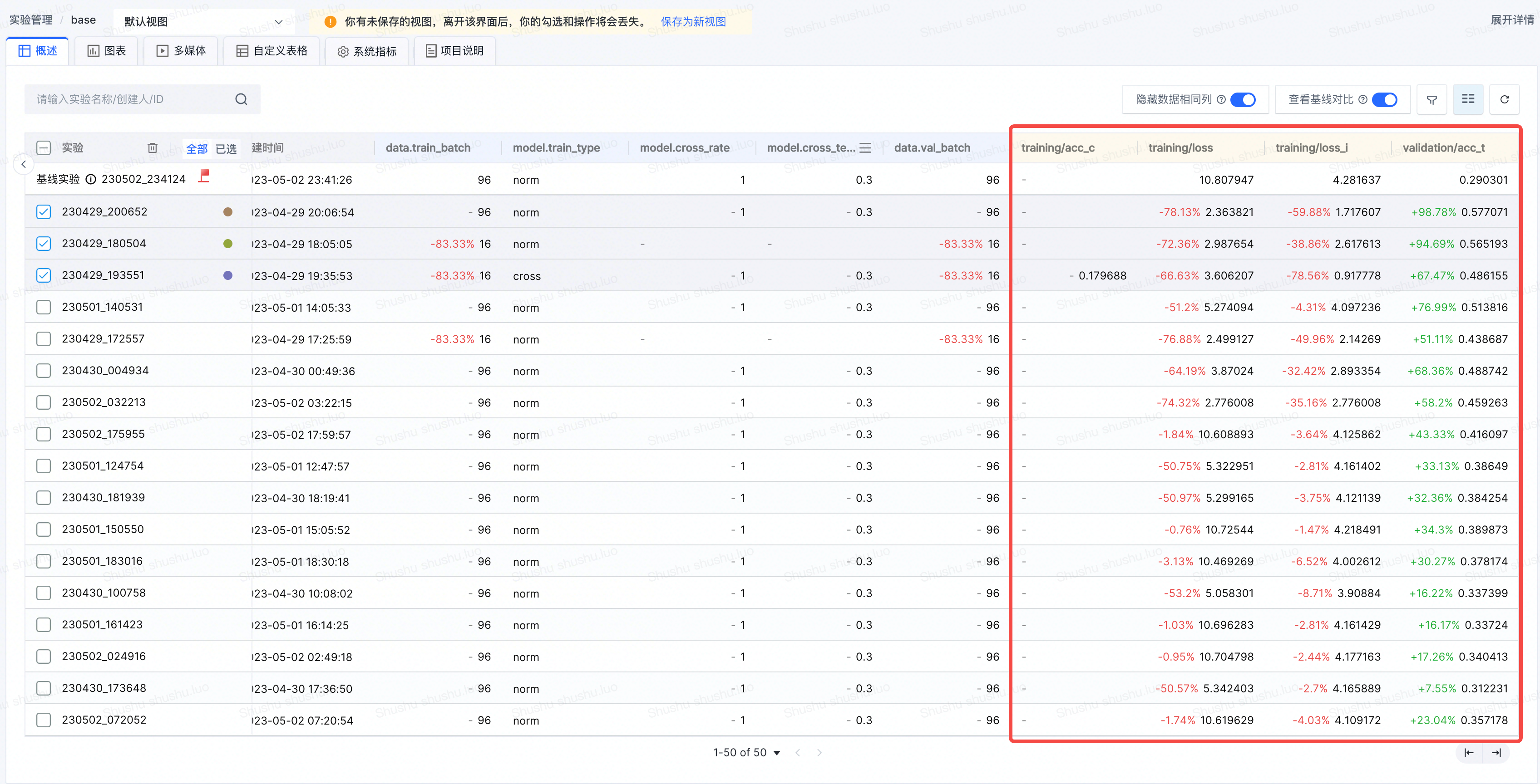 记录为config的超参数数据,可在概述页面进行查看,并和其他run进行对比。