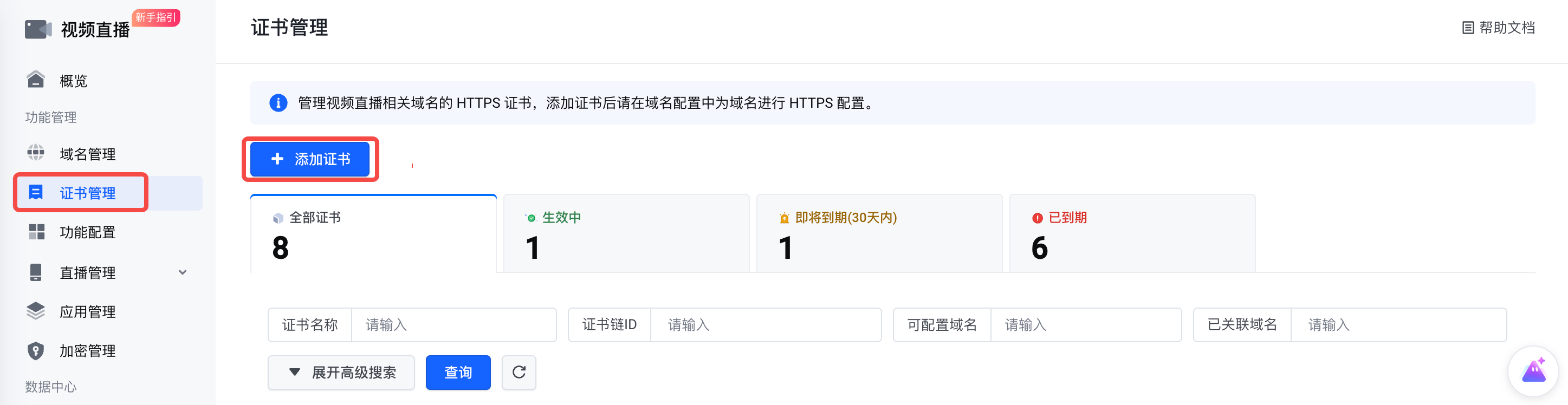 左侧导航栏选择功能管理 > 证书管理,进入证书管理页面。