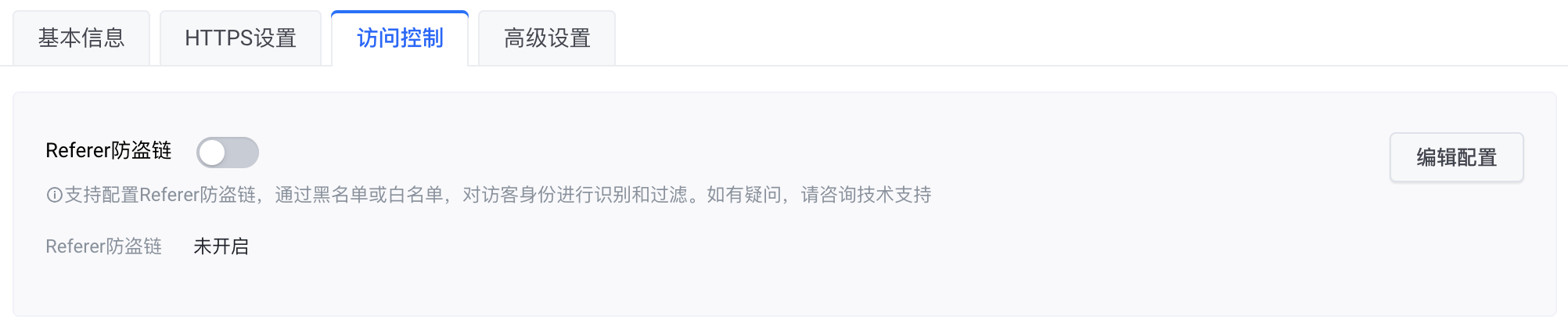 选择访问控制页签,在 Referer 防盗链 模块,打开配置开关或单击编辑配置,弹出配置防盗链规则对话框。