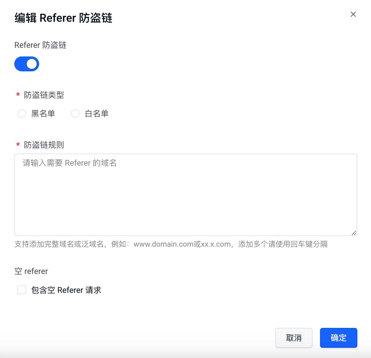| 防盗链类型 | 单选项,支持选择黑名单或白名单。 |