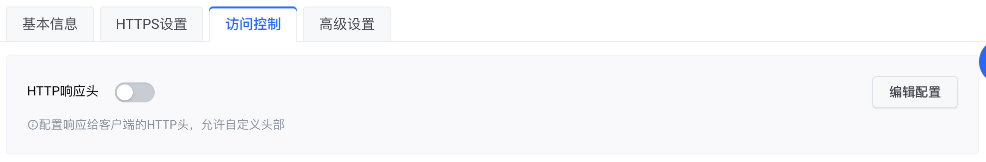 选择访问控制页签,在HTTP 响应头模块,打开配置开关或单击编辑配置,弹出 HTTP 响应头设置对话框。