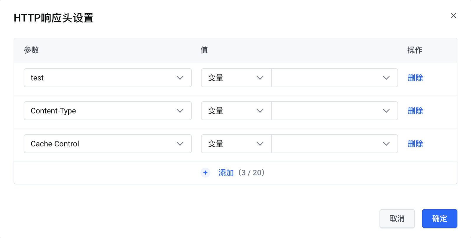 在 HTTP 响应头设置对话框自定义或选择已有响应头参数进行配置。