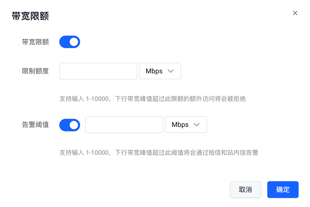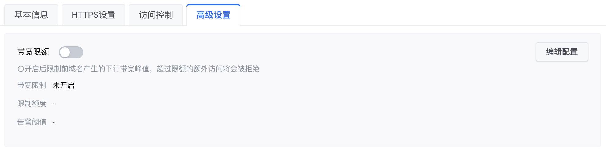 选择高级设置页签,在带宽限额 模块,打开配置开关或单击编辑配置,在弹出带宽限额对话框。
