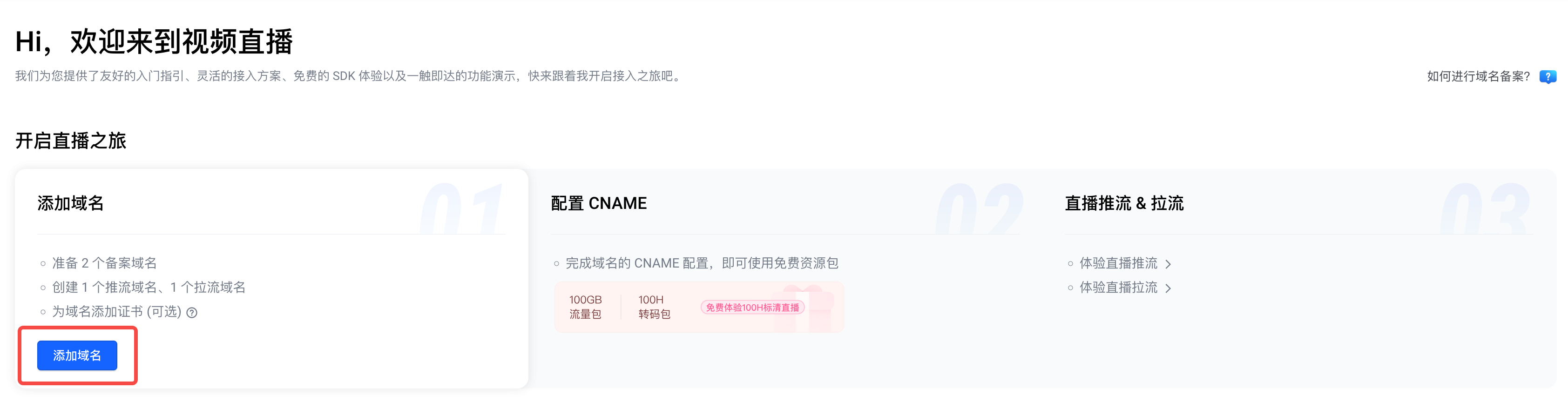 服务开通成功后,页面将自动跳转到开启直播之旅的新手引导界面(您也可以点击控制台顶部的产品名称,进入新手指引界面),您将在此完成域名的添加和配置。