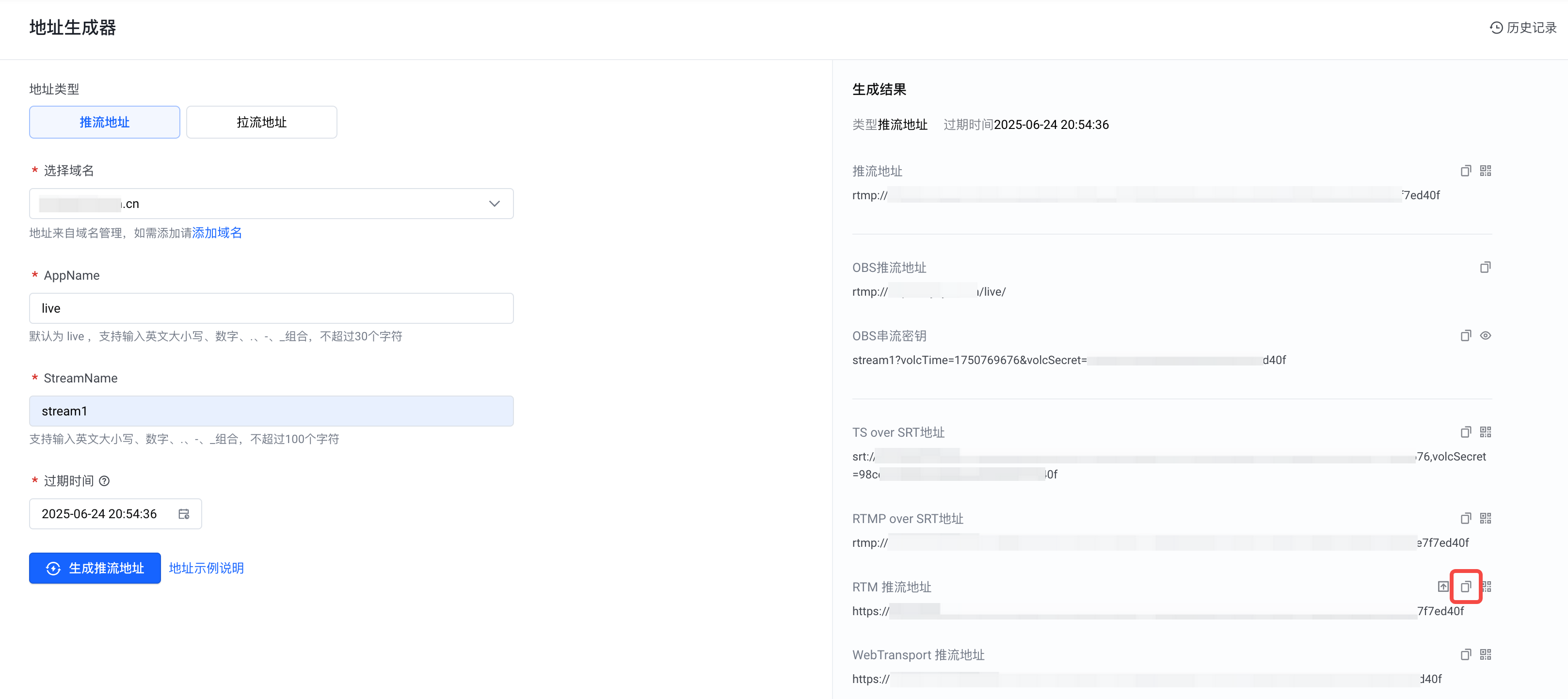 成功生成后,复制并保存推流地址,用于后续推流操作。
