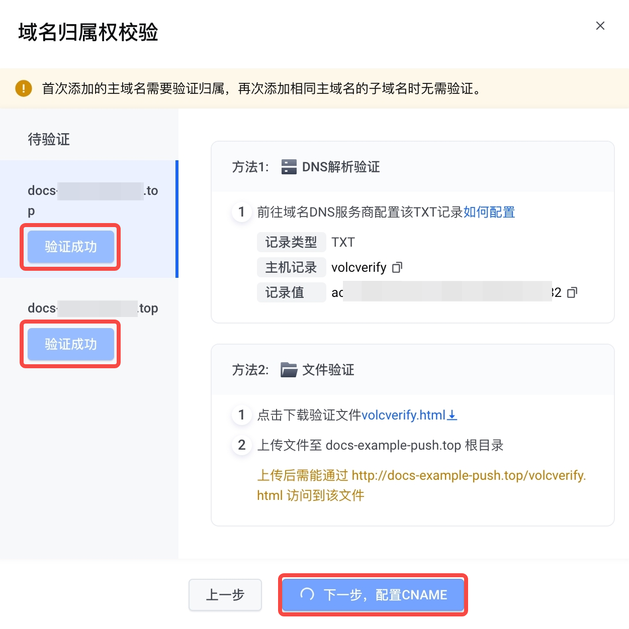 首次添加域名的主域名需要进行归属权校验,以确认您对该域名拥有所有权。校验通过后,您再次添加该主域名的其他子域名时则无需重复验证。