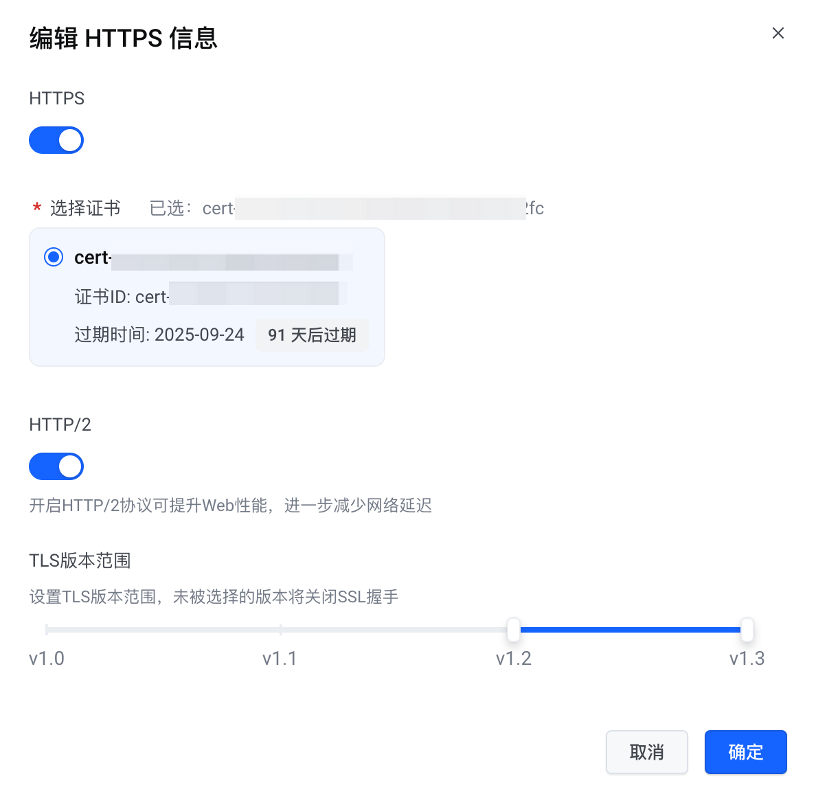 在编辑 HTTPS 信息对话框中,选择已上传的域名证书,其他信息可保持默认配置。