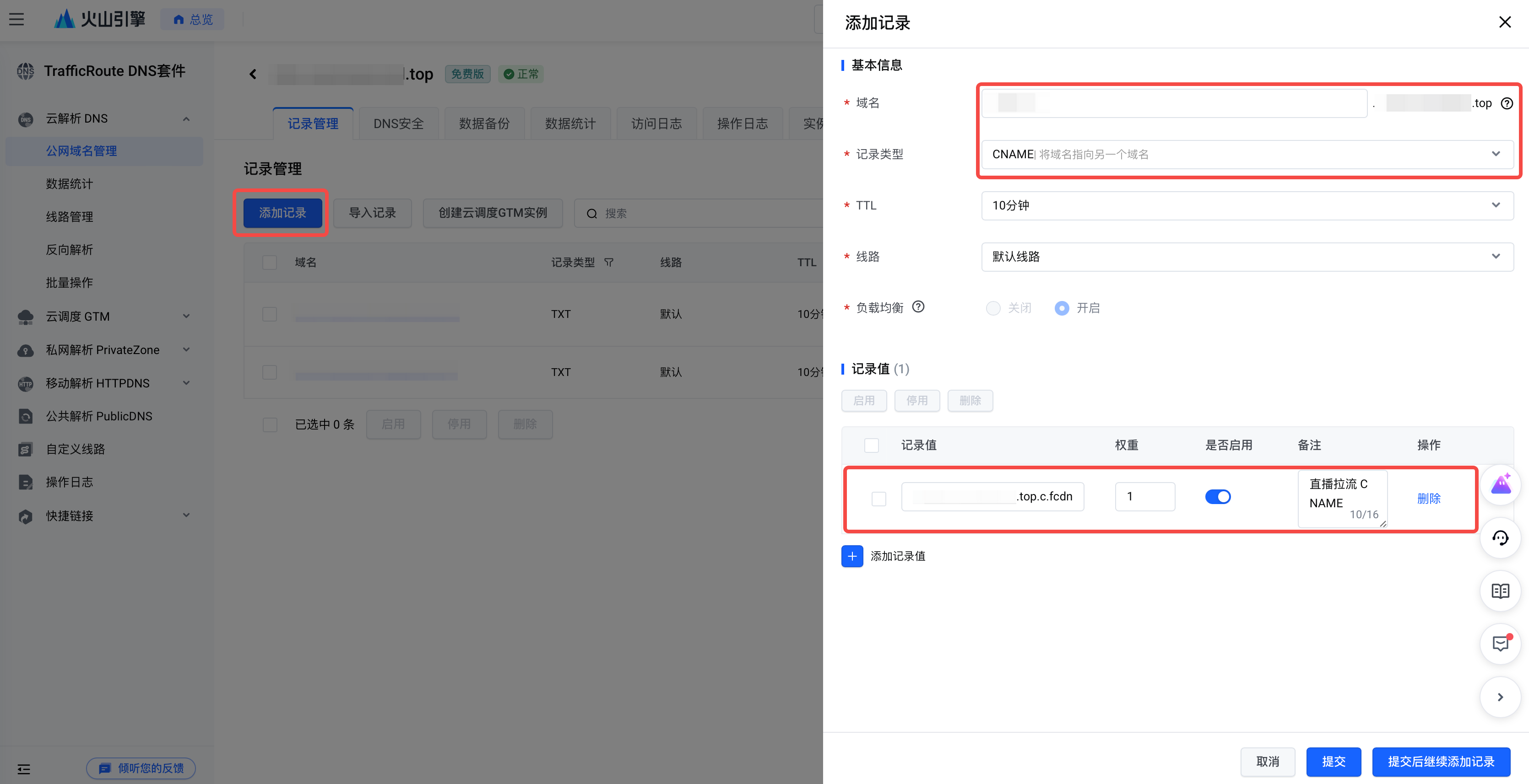 进入您域名的 DNS 解析服务控制台,添加 CNAME 解析记录。以火山引擎 TrafficRoute DNS 套件为例,配置方法如下: