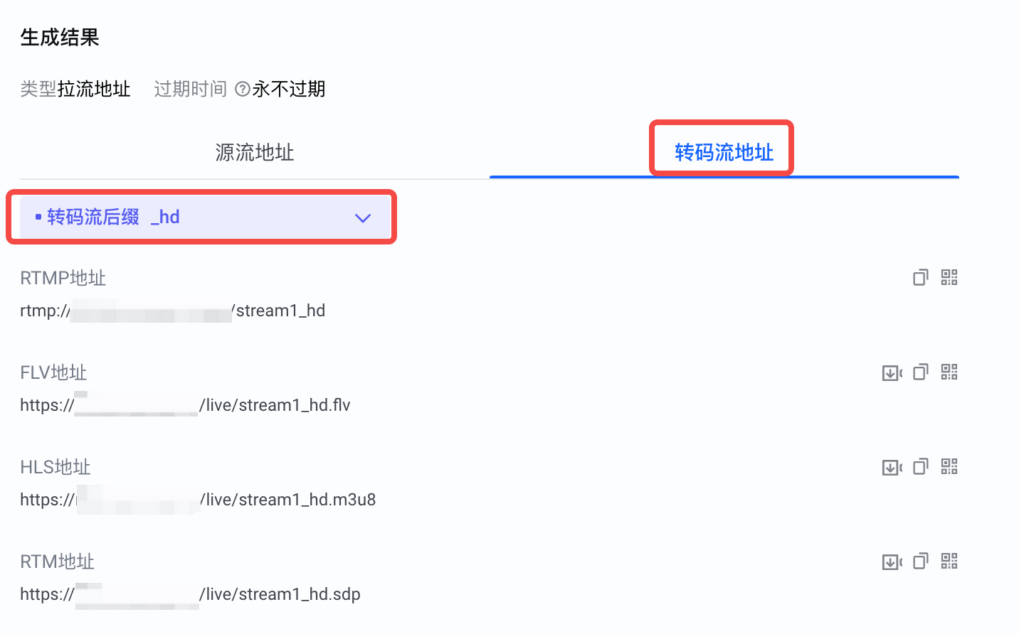 (可选)如您已配置转码模板,且希望观看不同清晰度的直播内容,请在生成结果中切换到转码流地址页签,并从中选择所需的转码流后缀,例如,_hd、_sd、_ld,即可获取对应清晰度的拉流地址。