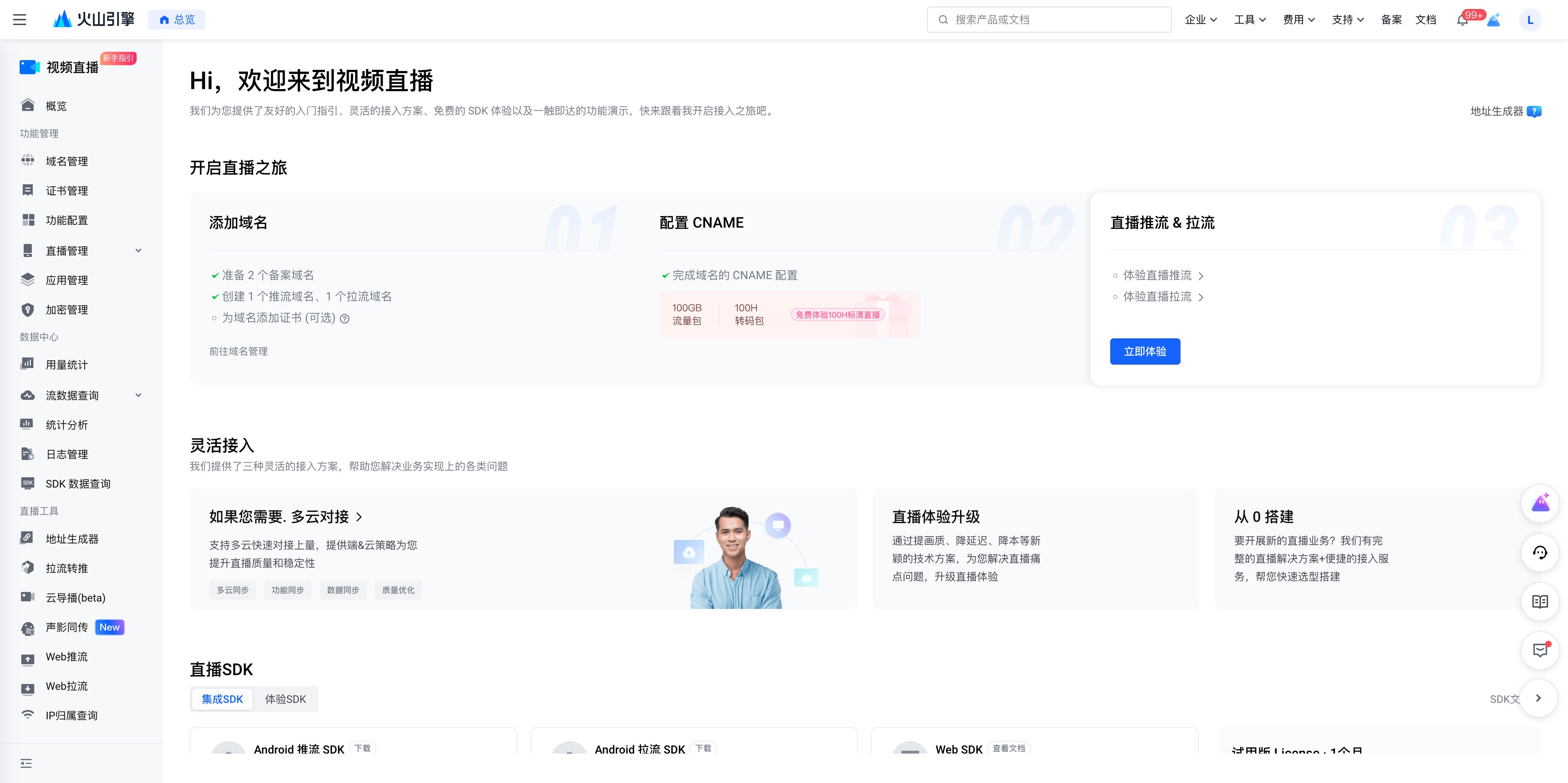 请访问视频直播控制台并使用您的火山引擎账号登录。登录后,系统默认进入视频直播产品欢迎页,如下图所示。