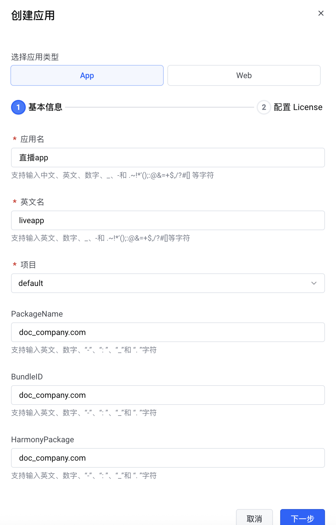 如您创建的 App 类型的应用,单击下一步,进入配置 License 页面。