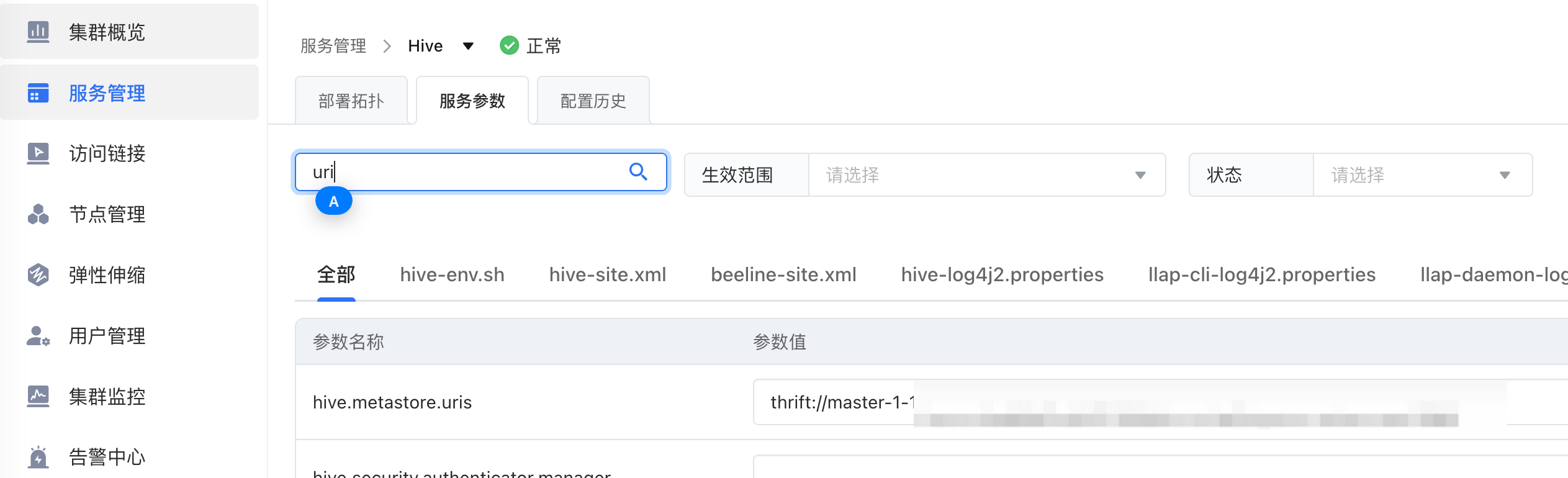 hive.metastore.uri的参数值。set serverless.cross.vpc.access.enabled = true; set serverless.cross.vpc.accountId = 2100075559; set serverless.cross.vpc.vpc.id = vpc-rrvu7a8xdtz4v0x591w1cfh; set serverless.cross.vpc.subnet.id = subnet-13f498o7sby803n6nu52cuy63; set serverless.cross.vpc.security.group.id = sg-rrvu7g60pzwgv0x58iryzbp; -- 开启DNS解析 set serverless.cross.vpc.dns.resolve.enabled = true; -- 在非LAS Catalog URI 下关闭默认LAS Catalog鉴权 set spark.sql.serverless.lf.auth.enabled = false; -- 设置为开源HMS读取方式 set spark.hadoop.hive.hms.client.is.public.cloud = false; -- 设置hms uri set spark.hadoop.hive.metastore.uris = thrift://master-1-1.emr-d4xxx:9083; show databases;