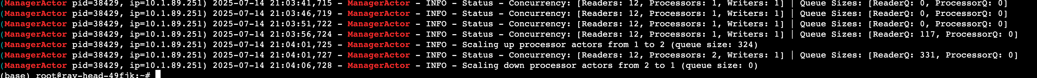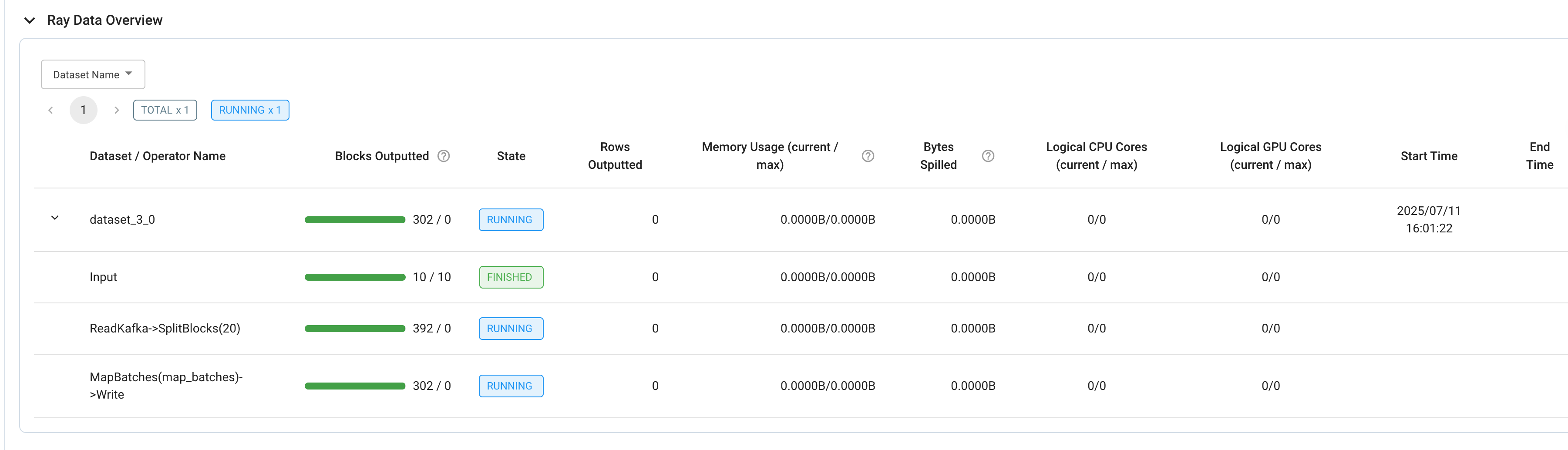 import ray ray.init(logging_config=ray.LoggingConfig(log_level="INFO")) consumer_config = { "bootstrap.servers": 'kafka-xxx.kafka.volces.com:9592,kafka-xxx.kafka.volces.com:9593,kafka-xxx.kafka.volces.com:9594', "security.protocol": "SASL_PLAINTEXT", # 'SASL_SSL' or 'SASL_PLAINTEXT' "sasl.mechanism": "PLAIN", "sasl.username": "xxx", "sasl.password": "xxx", "auto.offset.reset": 'earliest', // 从最早的消息开始读取(可选:'latest') "group.id": 'ray_consumer_group1', // 消费者组ID(不同组独立消费) } ds = ray.data.read_kafka(bootstrap_servers="kafka-xxx.kafka.volces.com:9592,kafka-xxx.kafka.volces.com:9593,kafka-xxx.kafka.volces.com:9594", topic = 'dujl_test', consumer_config=consumer_config) producer_config = { "bootstrap.servers": 'kafka-xxx.kafka.volces.com:9592,kafka-xxx.kafka.volces.com:9593,kafka-xxx.kafka.volces.com:9594', "security.protocol": "SASL_PLAINTEXT", // 'SASL_SSL' or 'SASL_PLAINTEXT' "sasl.mechanism": "PLAIN", "sasl.username": "xxxx", "sasl.password": "xxxx", } def map_batches(record): // 示例:假设原始 JSON 中包含 "name" 和 "age" 字段 // 可以新增字段或修改现有字段 return record ds.map_batches(map_batches, batch_size=200).write_kafka(bootstrap_servers="kafka-xxx.kafka.volces.com:9592,kafka-xxx.kafka.volces.com:9593,kafka-xxx.kafka.volces.com:9594", topic = 'dujl_test_ray_write', producer_config=producer_config)