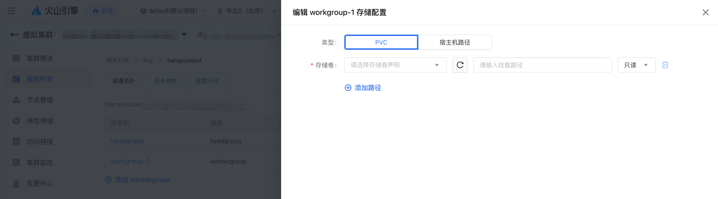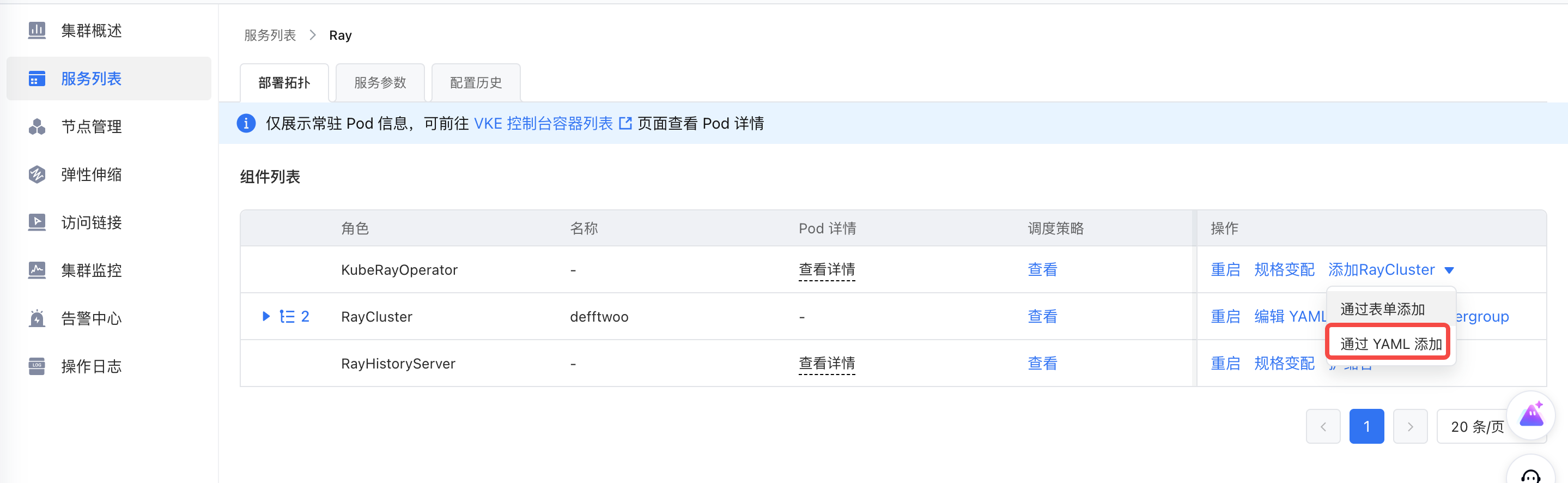 - 从左侧导航栏中,进入资源管理 > on VKE > 虚拟集群详情 > 服务列表 > Ray > RayCluster 。