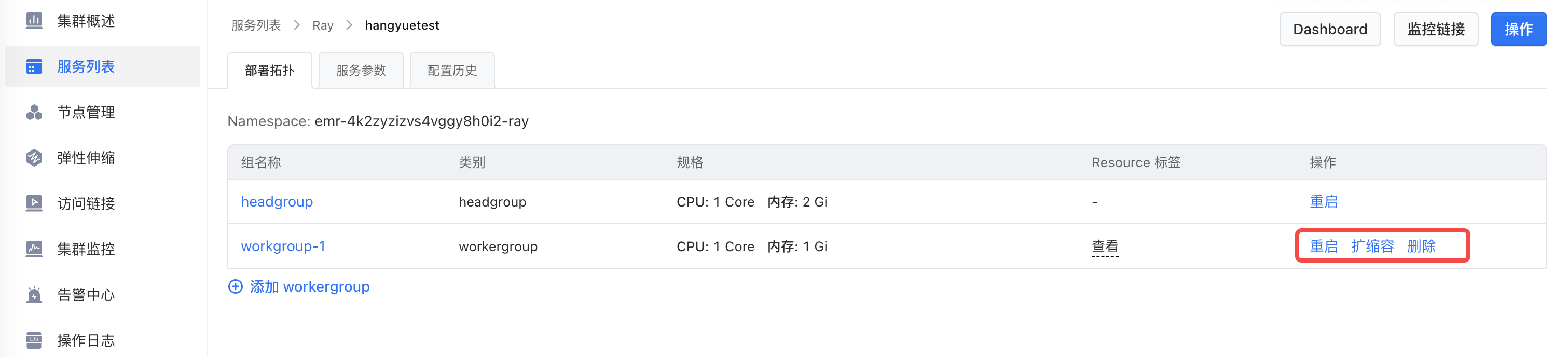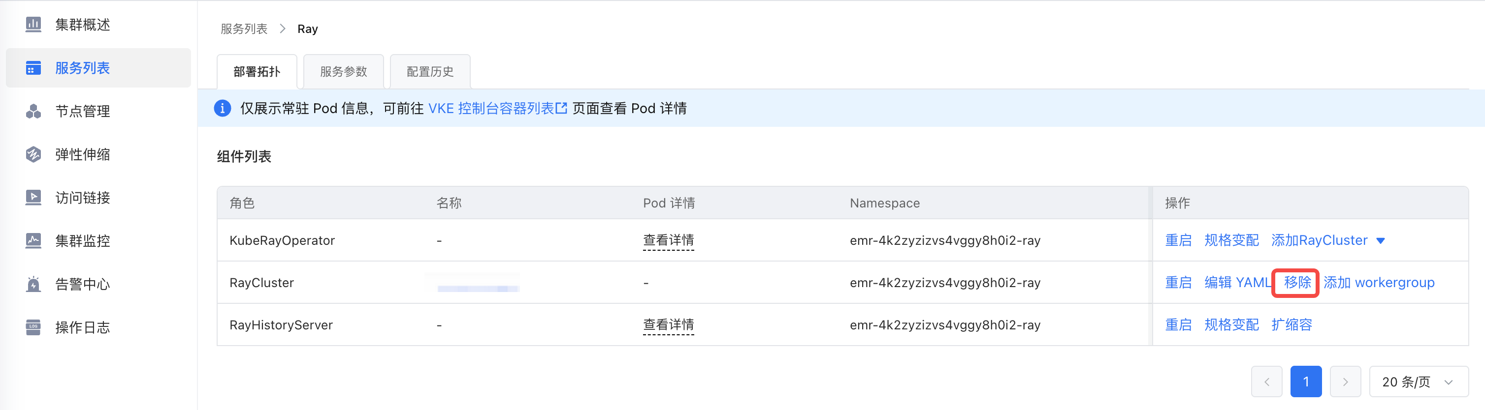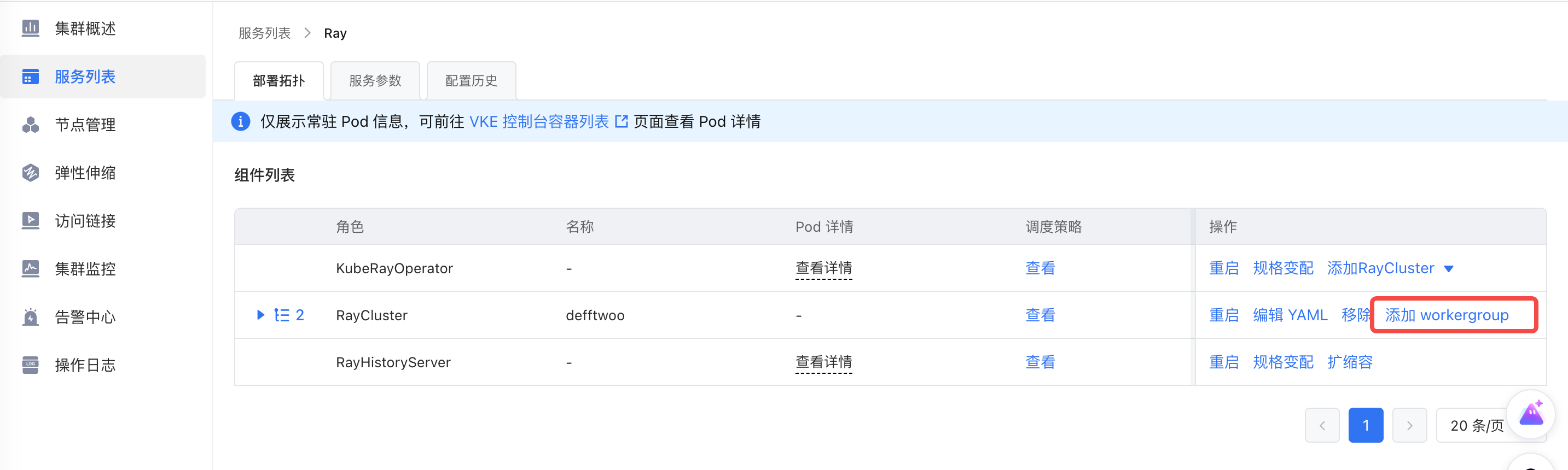 - 从左侧导航栏中,进入资源管理 > on VKE > 虚拟集群详情 > 服务列表 > Ray > RayCluster 名称 。