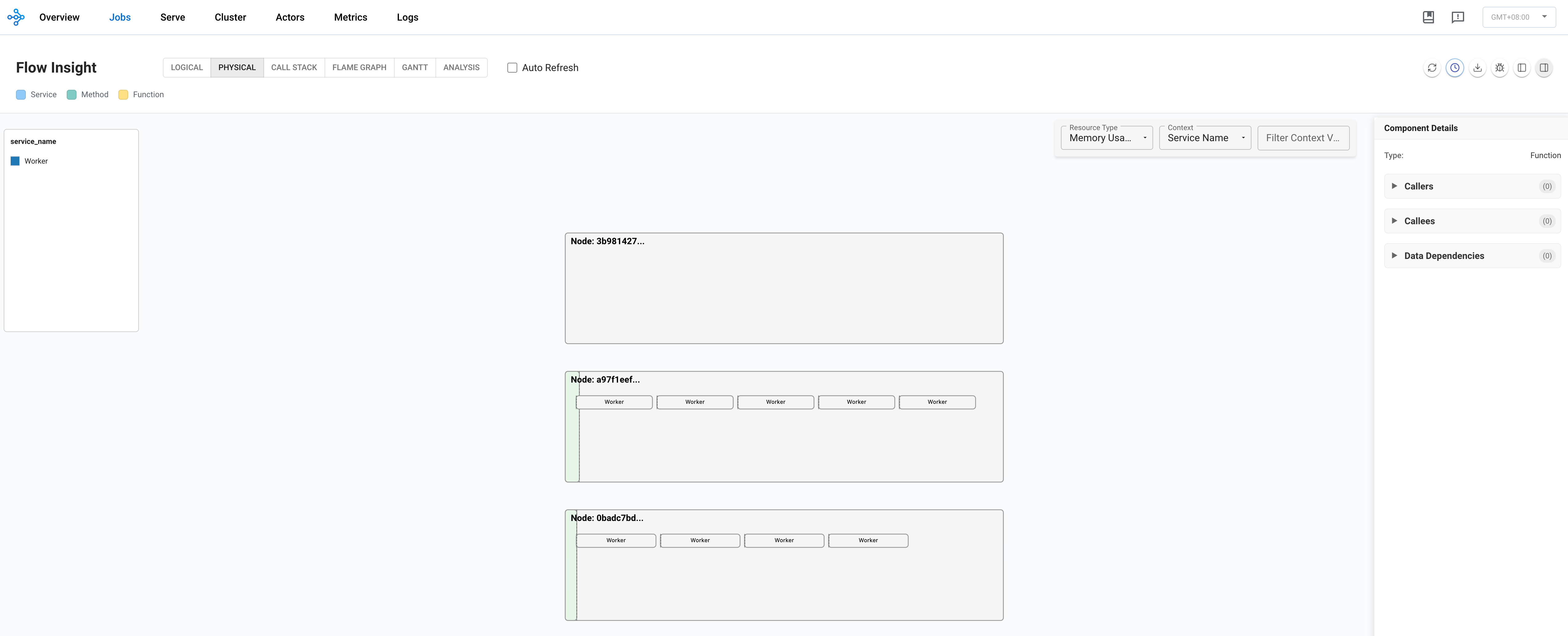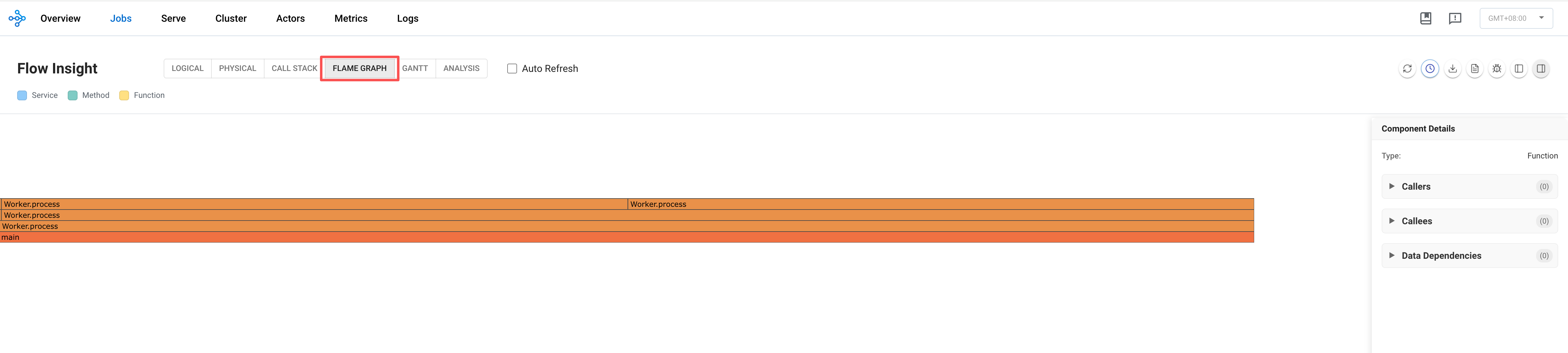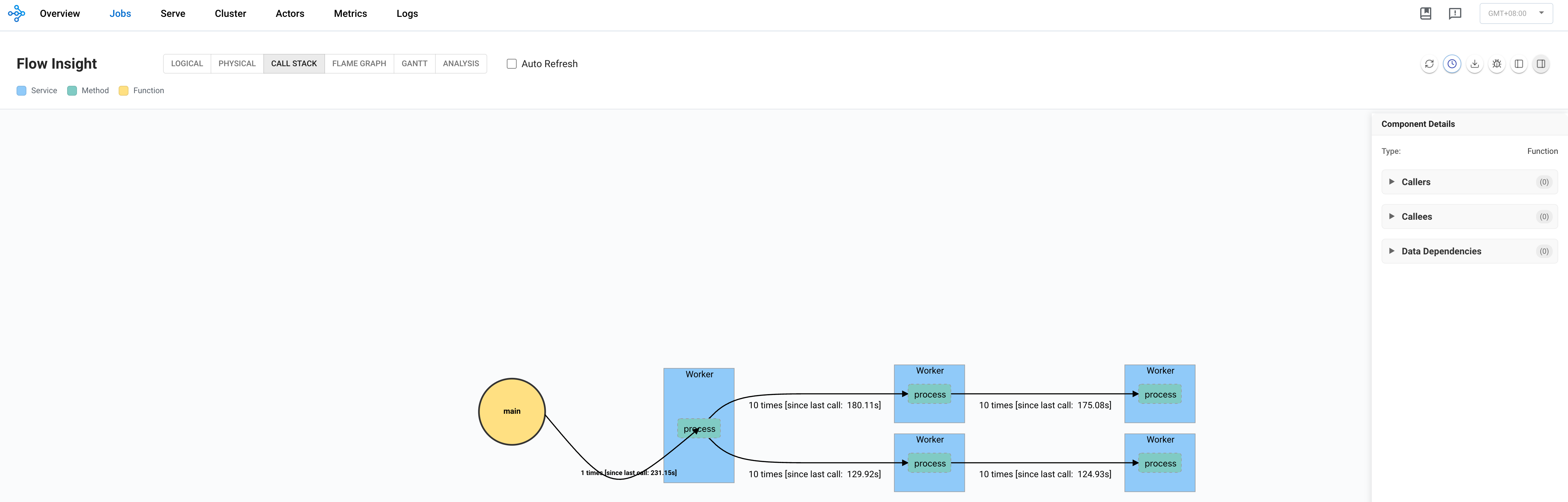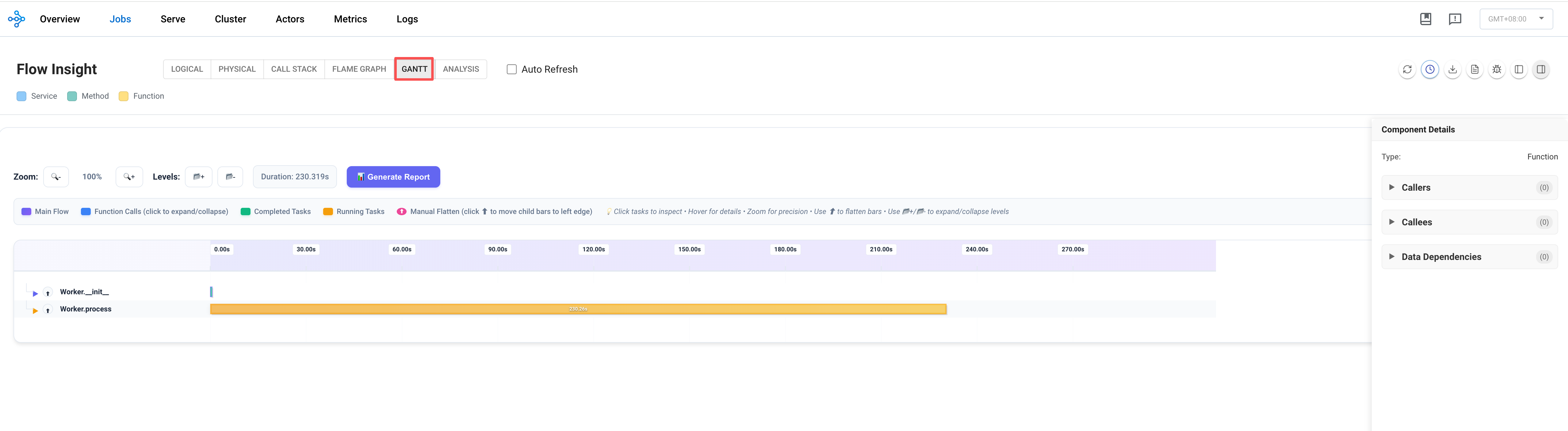 Flow Insight 视图为 Ray 应用的执行流程提供了强大的可视化功能,帮助用户理解分布式应用中 actors、tasks 和数据传输之间的关系。该视图提供了应用执行的逻辑视图、物理视图、分布式栈、火焰图、甘特图等五种可视化模式,便于分析性能、识别瓶颈并优化 Ray 工作负载。
