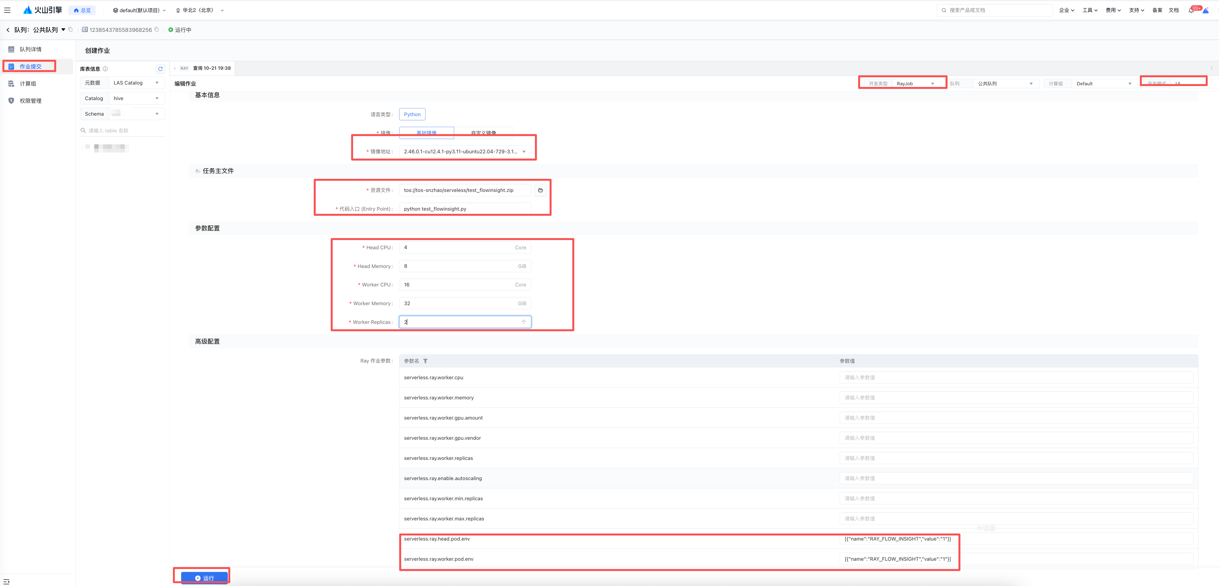 高级配置 | 运行 ray 作业时的参数配置,如果要开启 Flow Insight 的功能,必须设置 serverless.ray.head.pod.env 和 serverless.ray.worker.pod.env 两个参数的值为 |