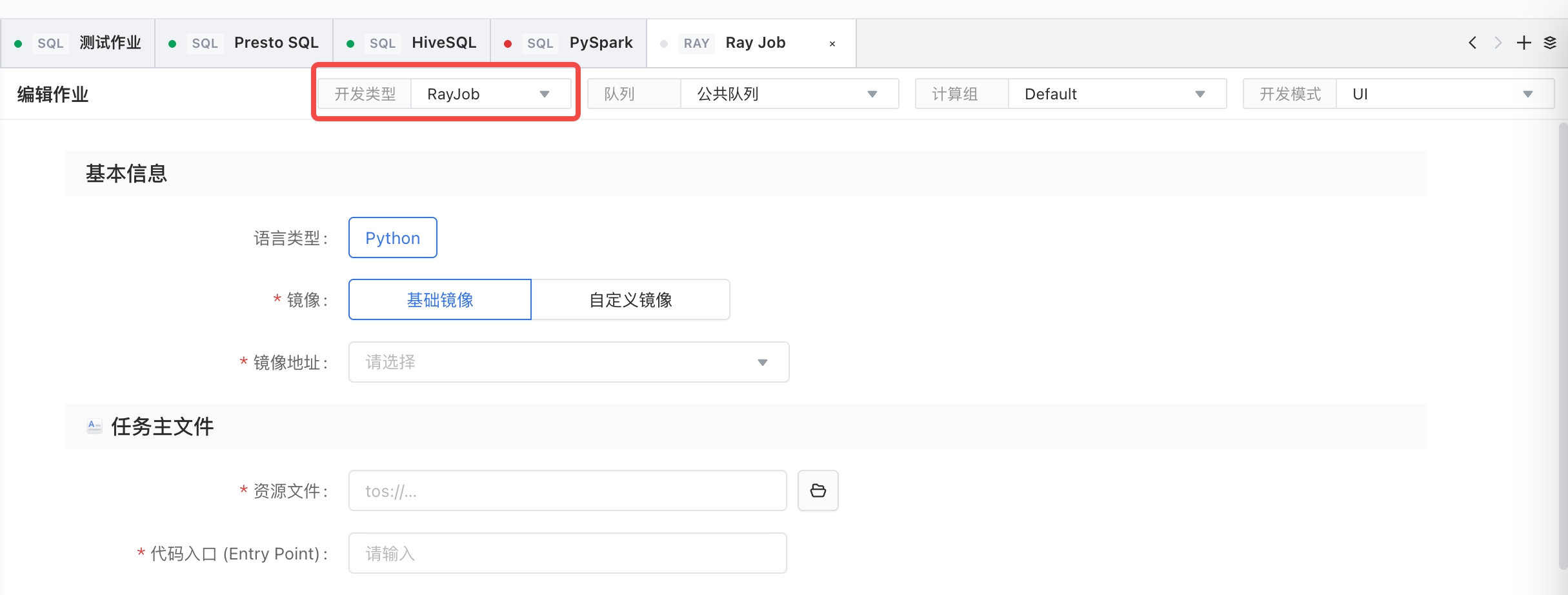 在作业编辑框的右上角,开发类型选择 PrestoSQL。