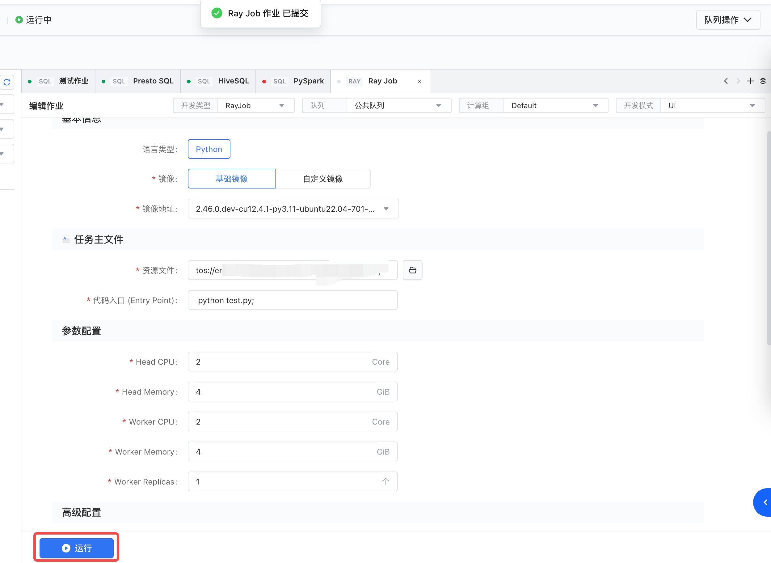 作业信息编辑完成后,即可点击运行按钮,提交成功后会在页面顶部显示Ray Job 作业 已提交,随后页面会自动跳转到作业管理页并筛选出该Ray Job作业。