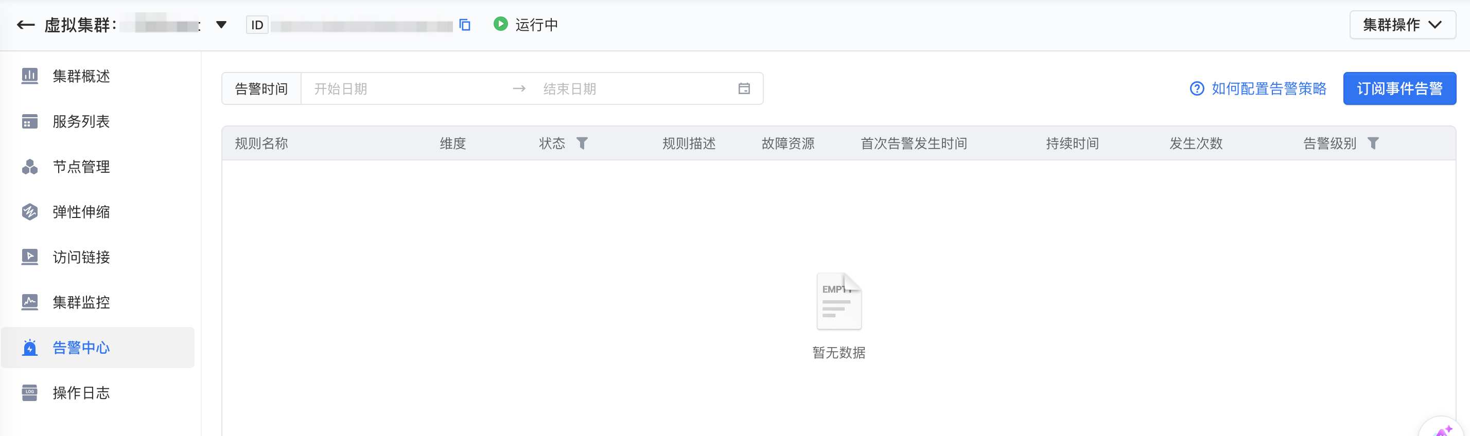 在 EMR on VKE 控制台 > 集群详情 > 告警中心页面提供了快捷查看对应集群告警历史的页面,适用于集群故障排查、日常健康检查等场景。展示如下: