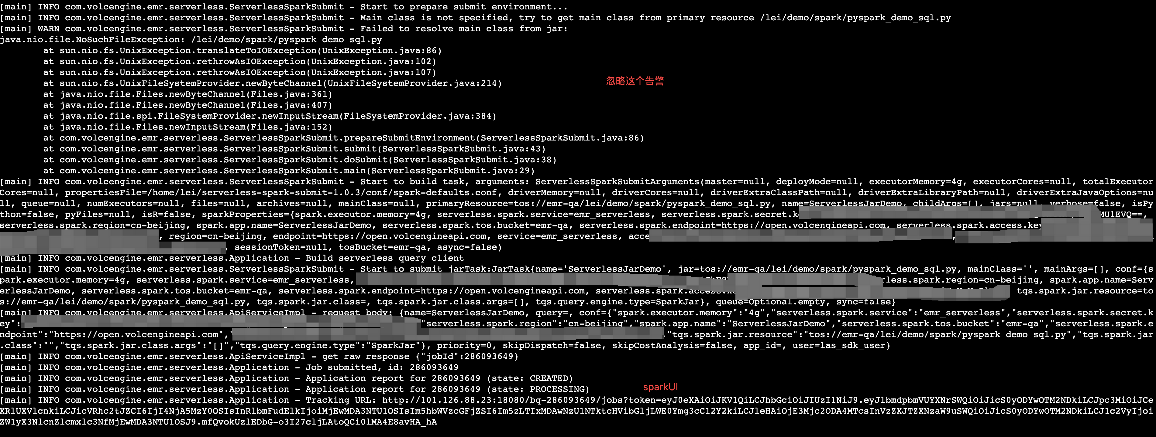 ${SERVERLESS_SDK_HOME}/bin/spark-submit --tos-endpoint tos-cn-beijing.ivolces.com --properties-file ${SERVERLESS_SDK_HOME}/conf/spark-defaults.conf tos://${tos path}/demo.py