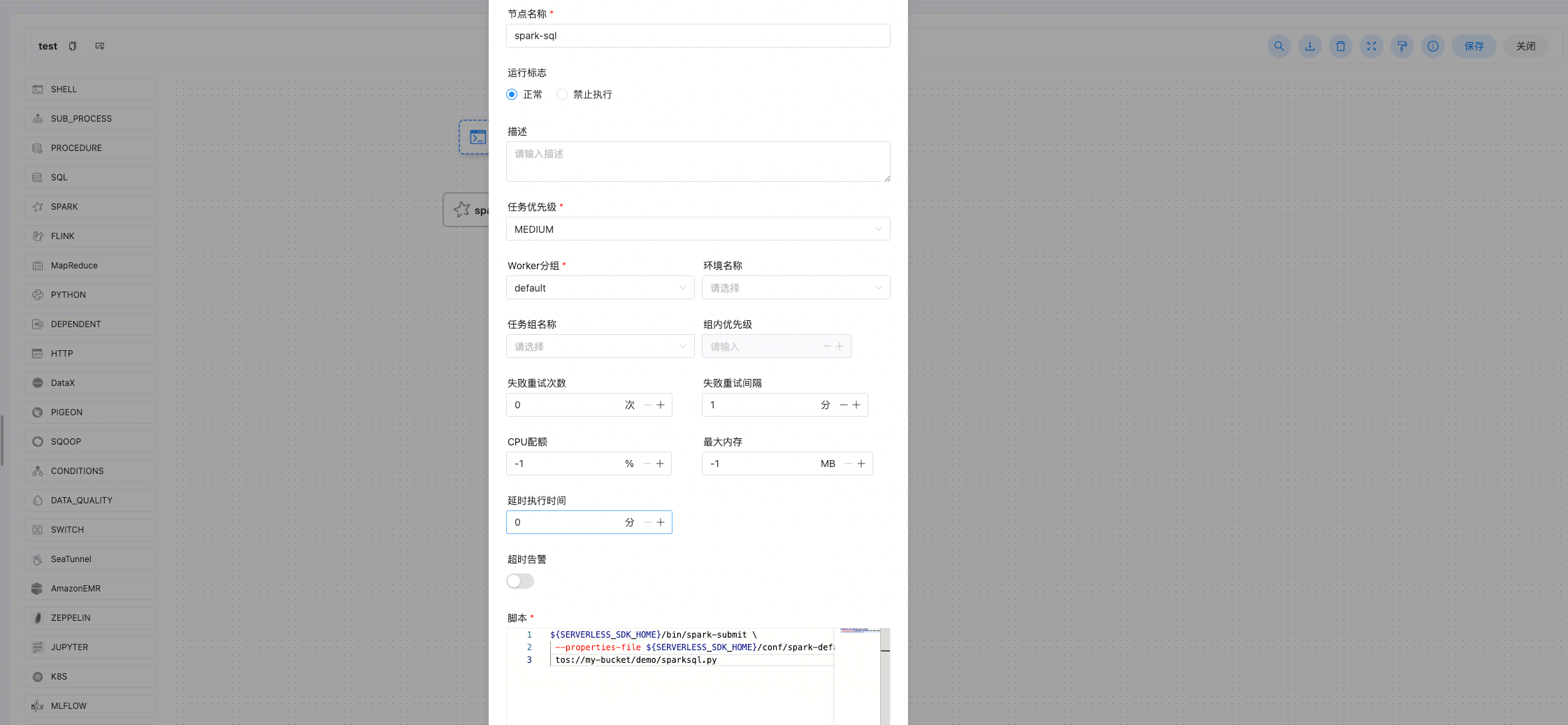 Dolphin(直到3.1.9 版本) Spark Task 仍需要选择 SPARK1 或者 SPARK2,含义是底层会使用 ${SPARK_HOME1}/bin/spark-submit 还是 ${SPARK_HOME2}/bin/spark-submit 工具去提交作业。因此,这里需要提前在 /etc/profile 中配置 SPARK_HOME1 或 SPARK_HOME2,使得可以正确使用 Serverless spark-submit