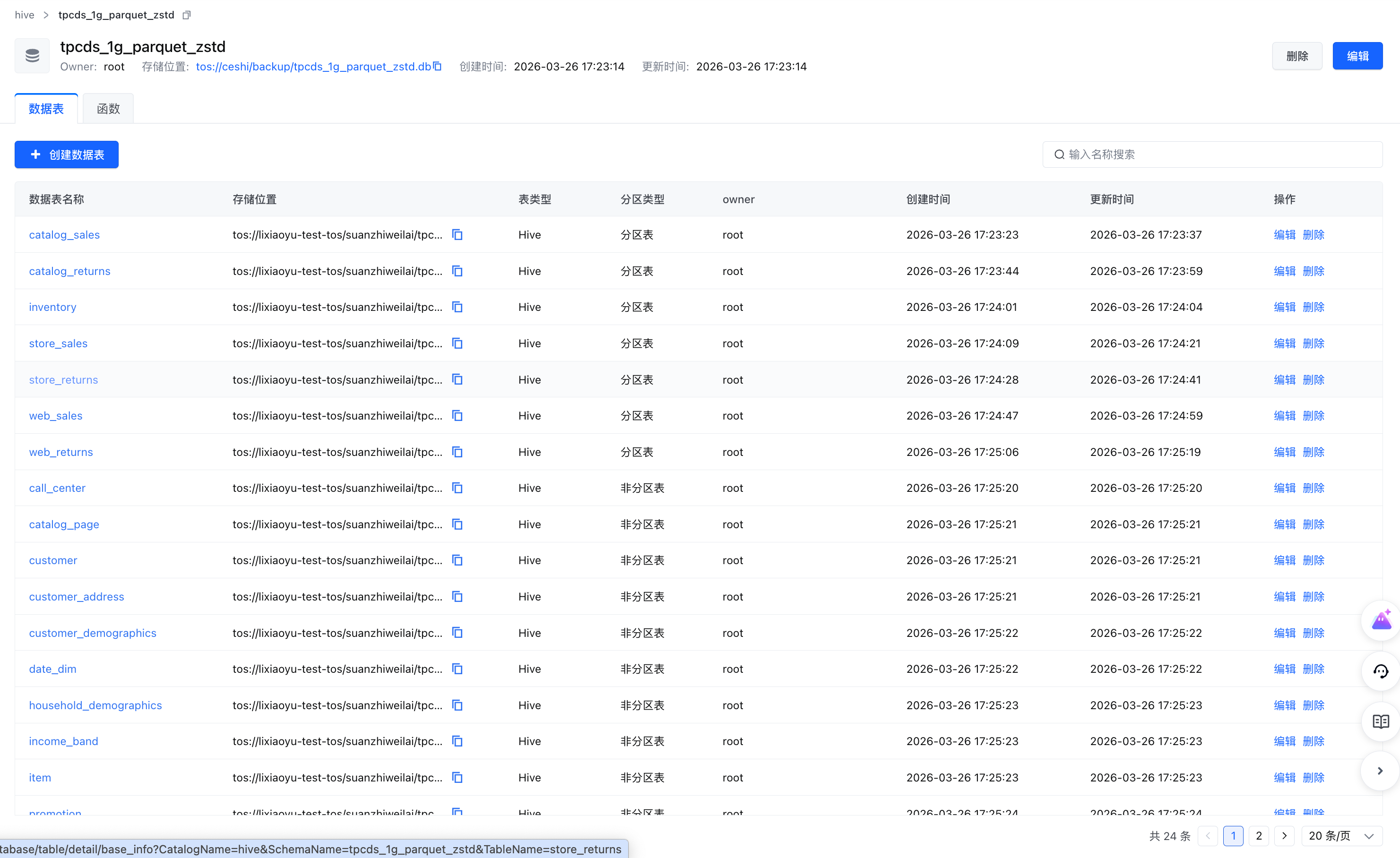 2. 结果检查。建表成功后可以在hive catalog下搜索到对应的库,例如:tpcds_1g_parquet_zstd。示例如下。