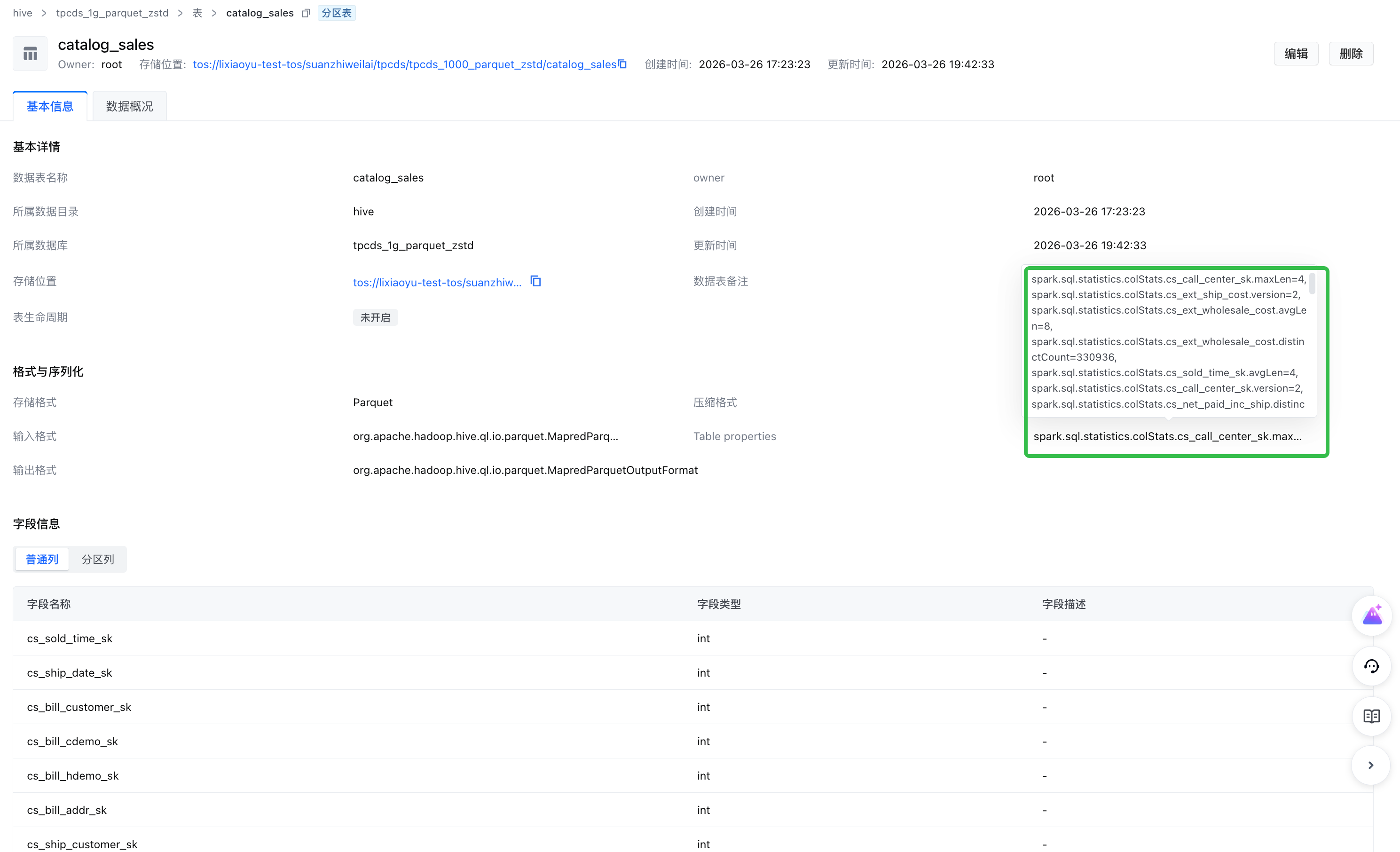 2. 结果检查。任务成功运行后可以在catalog中Table properties里看到相关分析统计信息。示例如下。