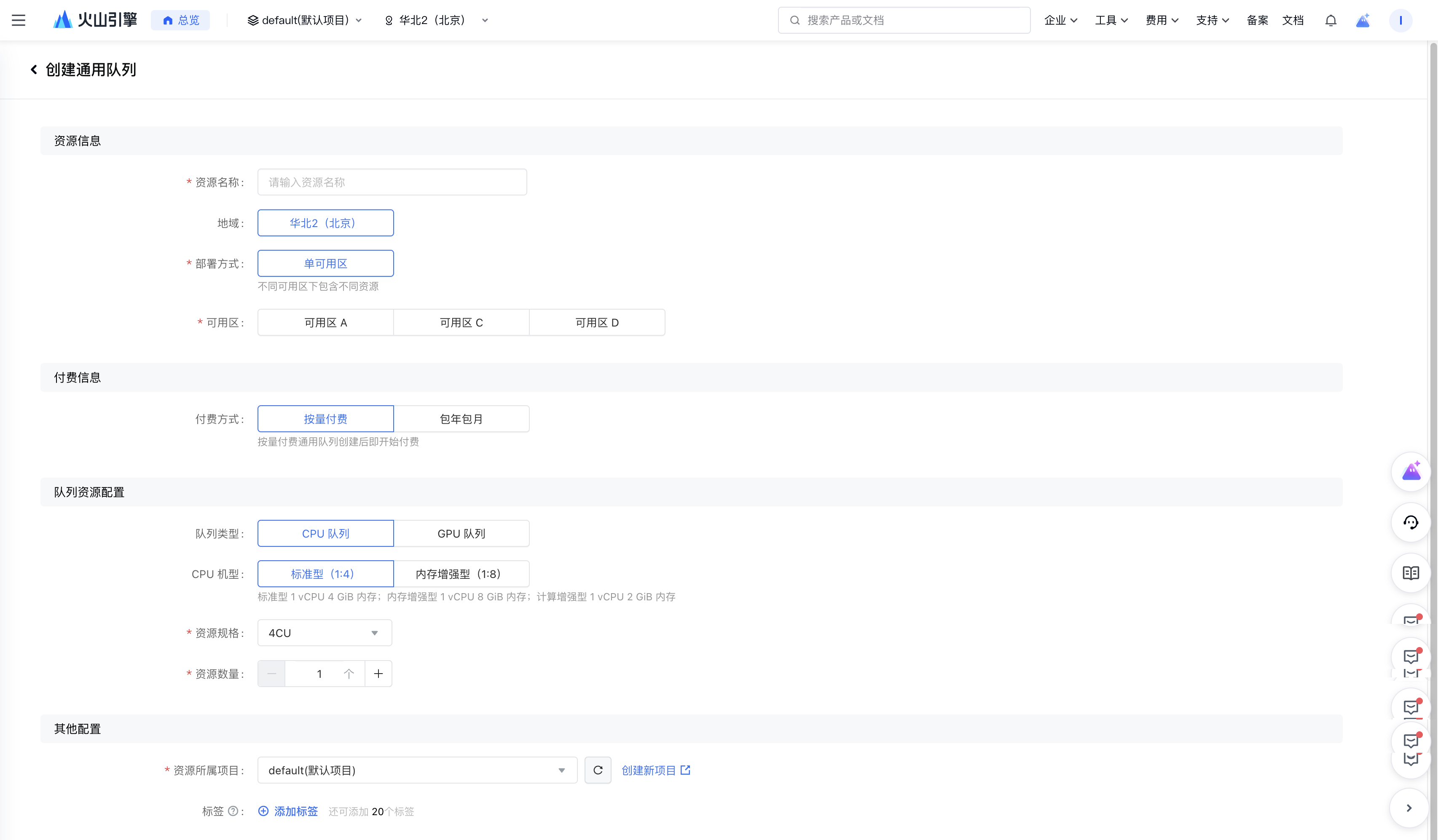其他配置 | 资源所属项目 | 资源项目(Project)是火山引擎提供的一种资源分组管理的机制,帮助达成逻辑层面的资源隔离,您能够通过资源项目进行项目制授权和分账等操作。详情参考项目概述。 |