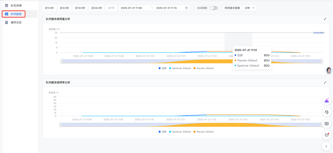 计算队列提供了资源使用量和资源使用率两种使用指标,并可按引擎类型细分呈现具体使用情况。