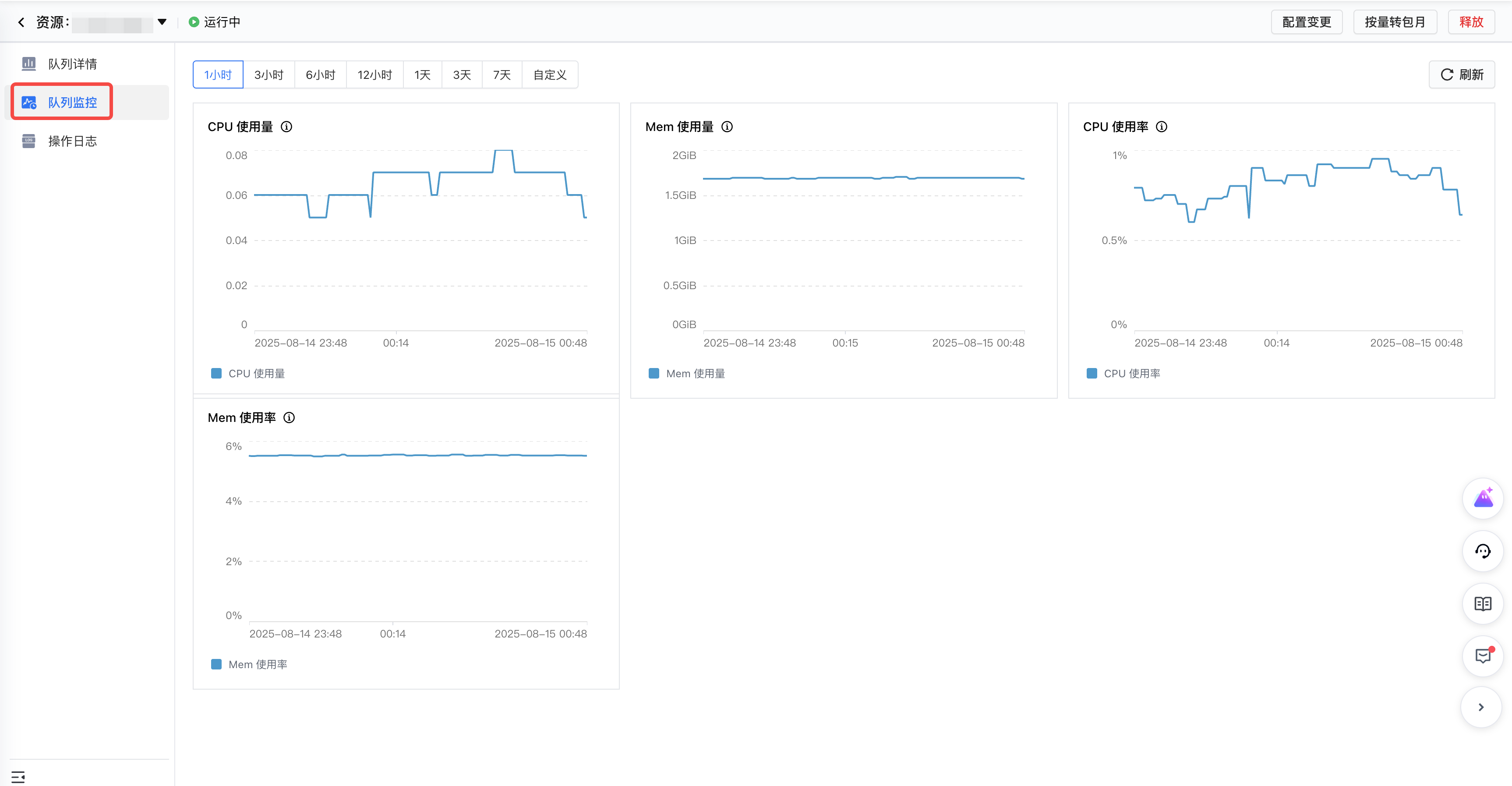 通用队列从 CPU 、内存的角度出发,分别提供了使用量与使用率两类指标。