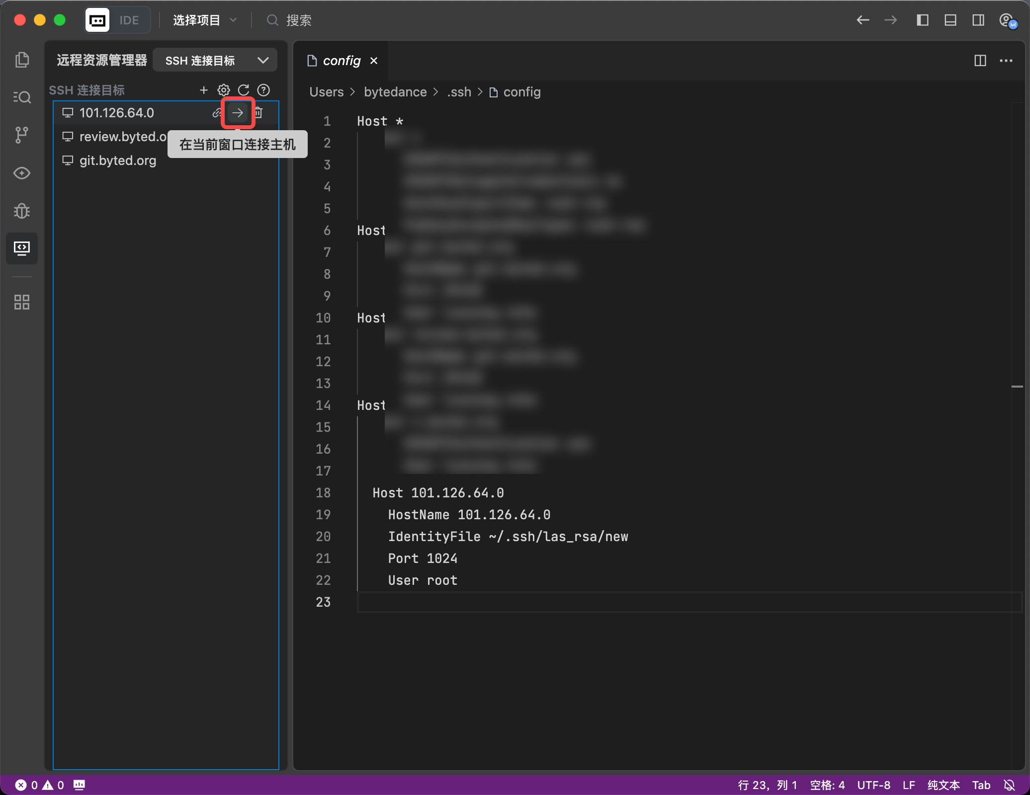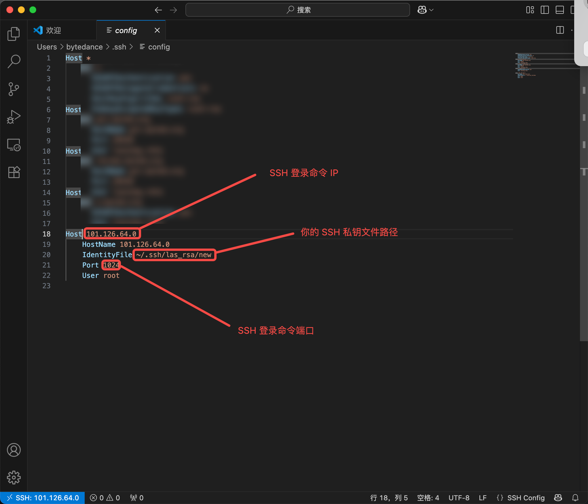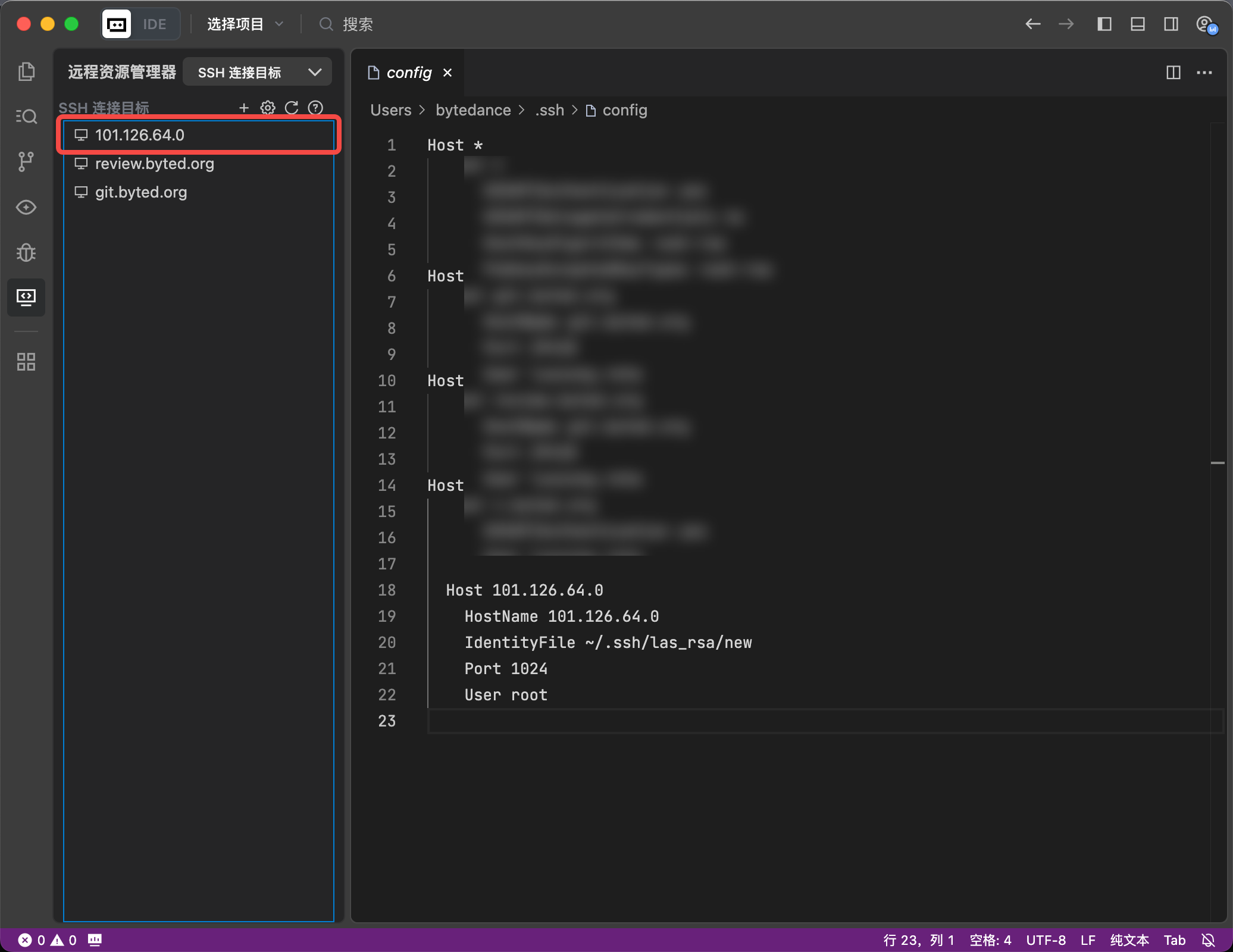 HOST 101.126.65.0 HostName 101.126.65.242 IdentityFile <your_rsa_path> Port <访问端口,即创建开发机时设置的 SSH 调用端口,如: Port 1024> User root