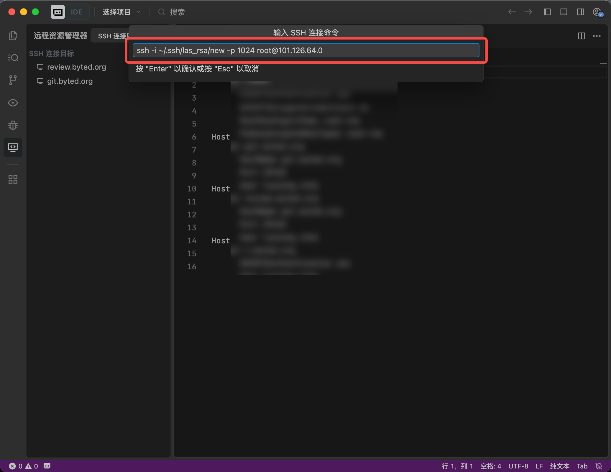 ssh -i ~/xxx/${ssh私钥名称} -p ${开发机调用端口} root@${负载均衡公网IP} # 「~/xxx/${ssh私钥名称}」 为您存储 SSH 私钥的路径 ssh -i ~/.ssh/las_rsa/new -p 1111 root@101.126.64.0