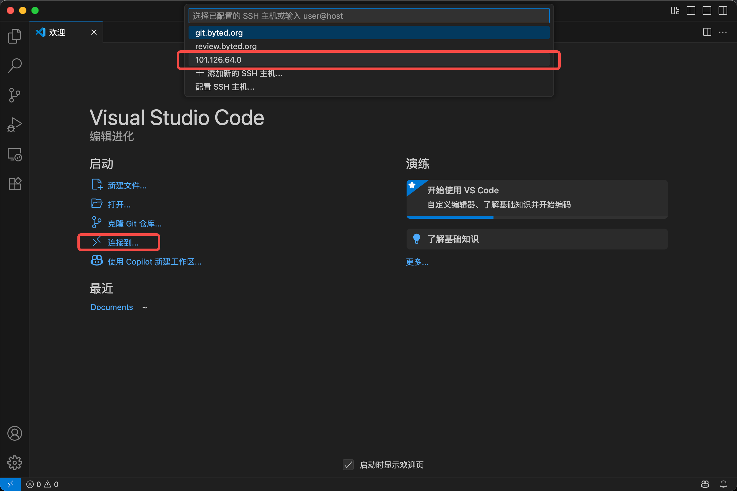 Connect to...(连接到...) 按钮,然后下拉列表中选择 Connect to Host...,选择刚才配置好的路径。说明