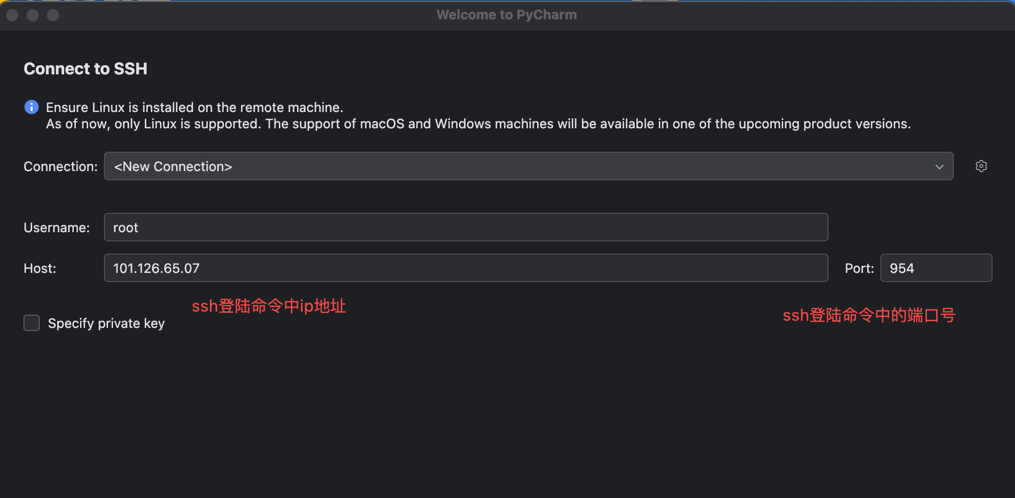 若本地私钥未存储在~/.ssh/默认路径,需用ssh -i ~/xxx/私钥文件 -p 端口号 用户名@服务器地址命令登录开发机。