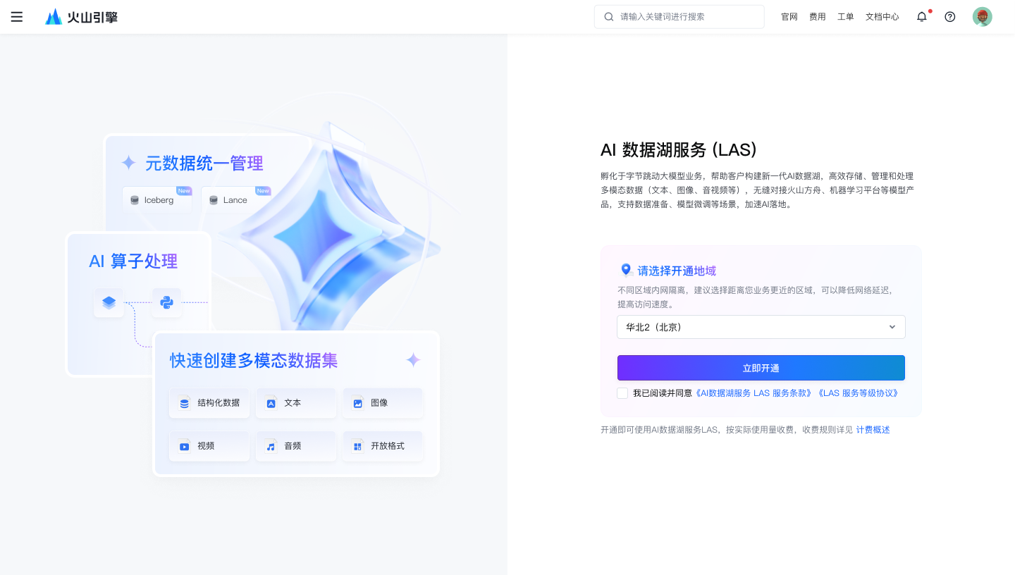 进入 LAS 控制台,首次开通将呈现开通界面,选择区域后一键开通产品服务。