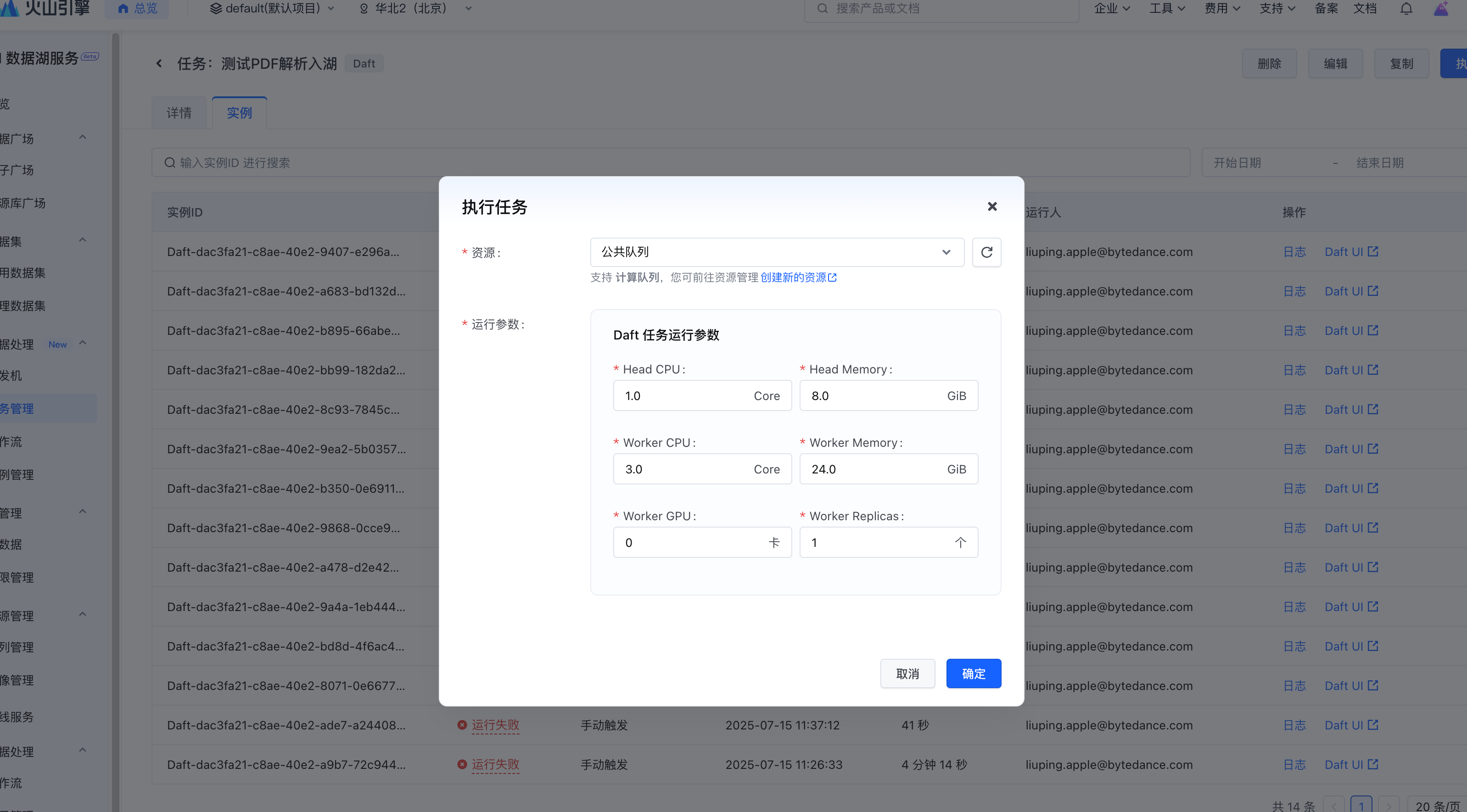 任务创建后,在任务列表中点击 执行,选择一个计算队列并配置资源,启动任务。