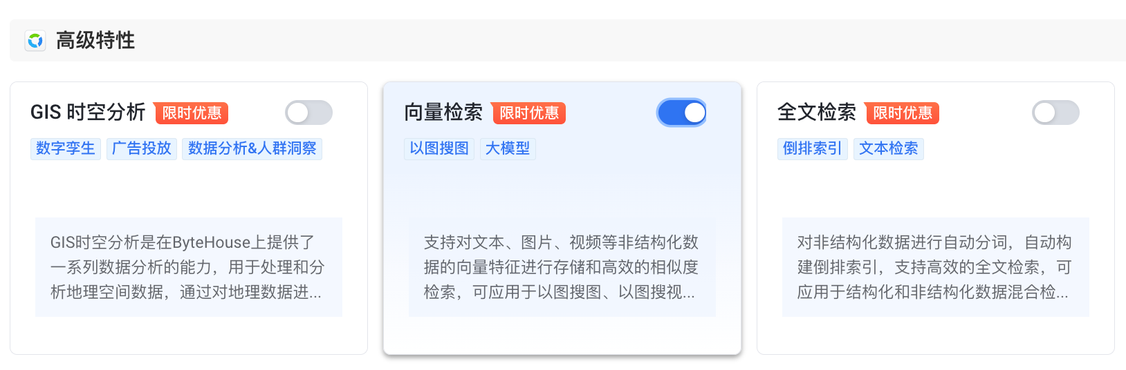 PDFParse 算子,对 PDF 进行深度解析,分离出纯文本内容和图片文件。ChunkTextSentenceSplitter 算子,将解析出的长文本切分为固定大小且有重叠的语义块。DoubaoEmbeddingVision 算子,分别对文本块和图片进行向量化,生成能够表征其语义的 Embedding 向量。ClickhouseWriter UDF,将处理后的文本块、图片路径及其对应的向量数据一同写入 ByteHouse 的指定表中。DoubaoEmbeddingVision 算子,将用户的文本查询(Query)转化为向量。cosineDistance),找出与查询向量最相似的 Top-K 个文本或图片向量。已开通 AI 数据湖服务、对象存储 TOS 和 ByteHouse 企业版。
