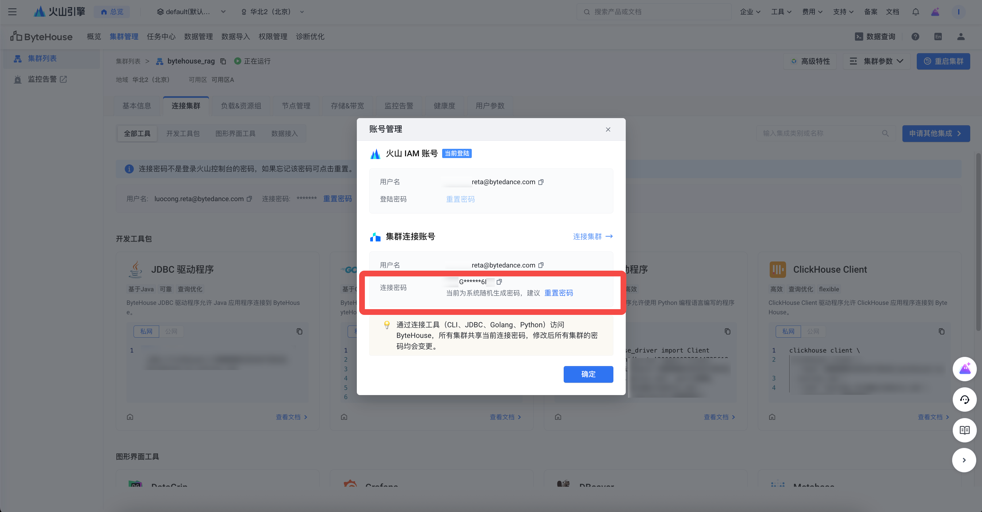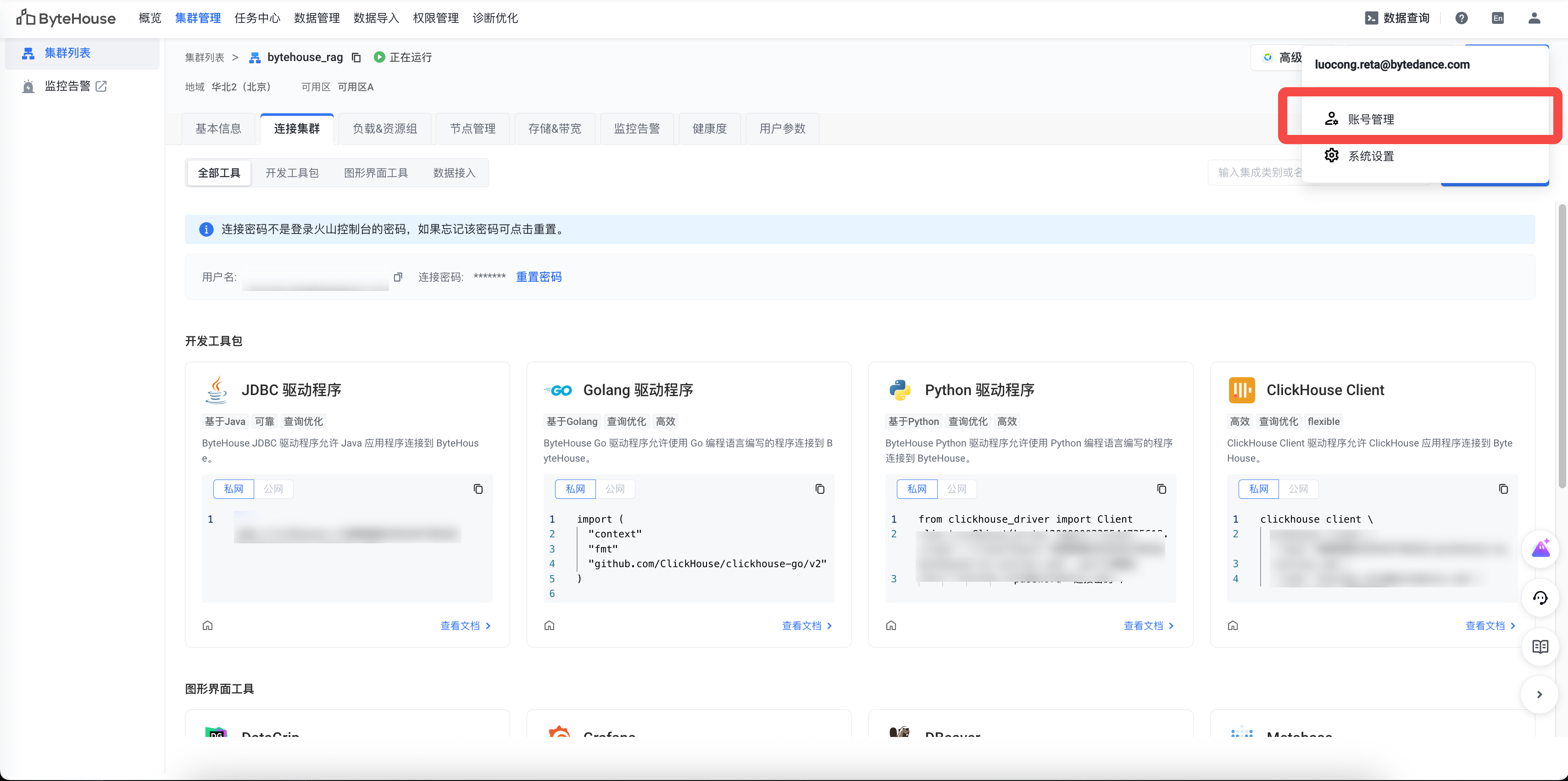 bh_host 从 Bytehouse 企业版 > 集群管理 > 基本信息" 的网关获取bh_port 默认是 8123bh_user 从 Bytehouse 企业版 > 集群管理 > 连接集群"获取bh_password 从账号管理获取密码.pub 文件内容) 粘贴到配置中。本实践基本操作流程如下所示: