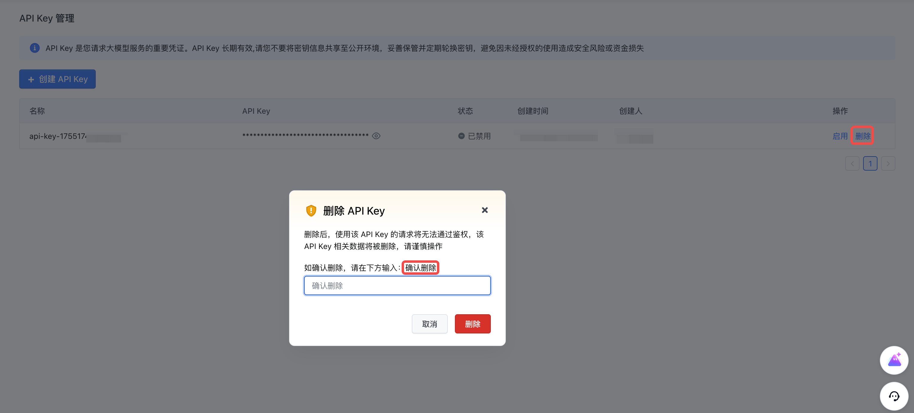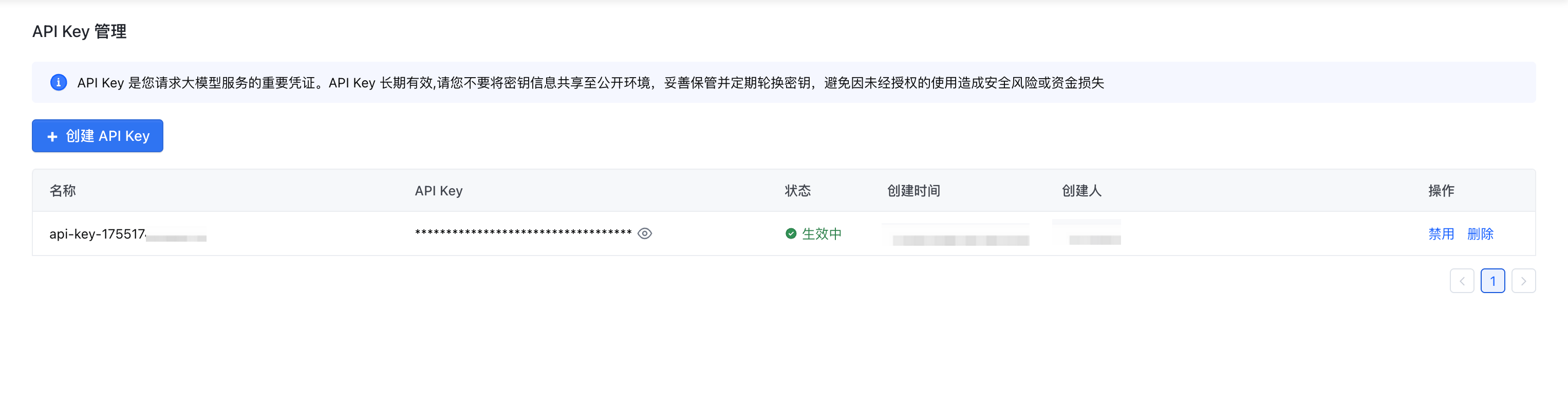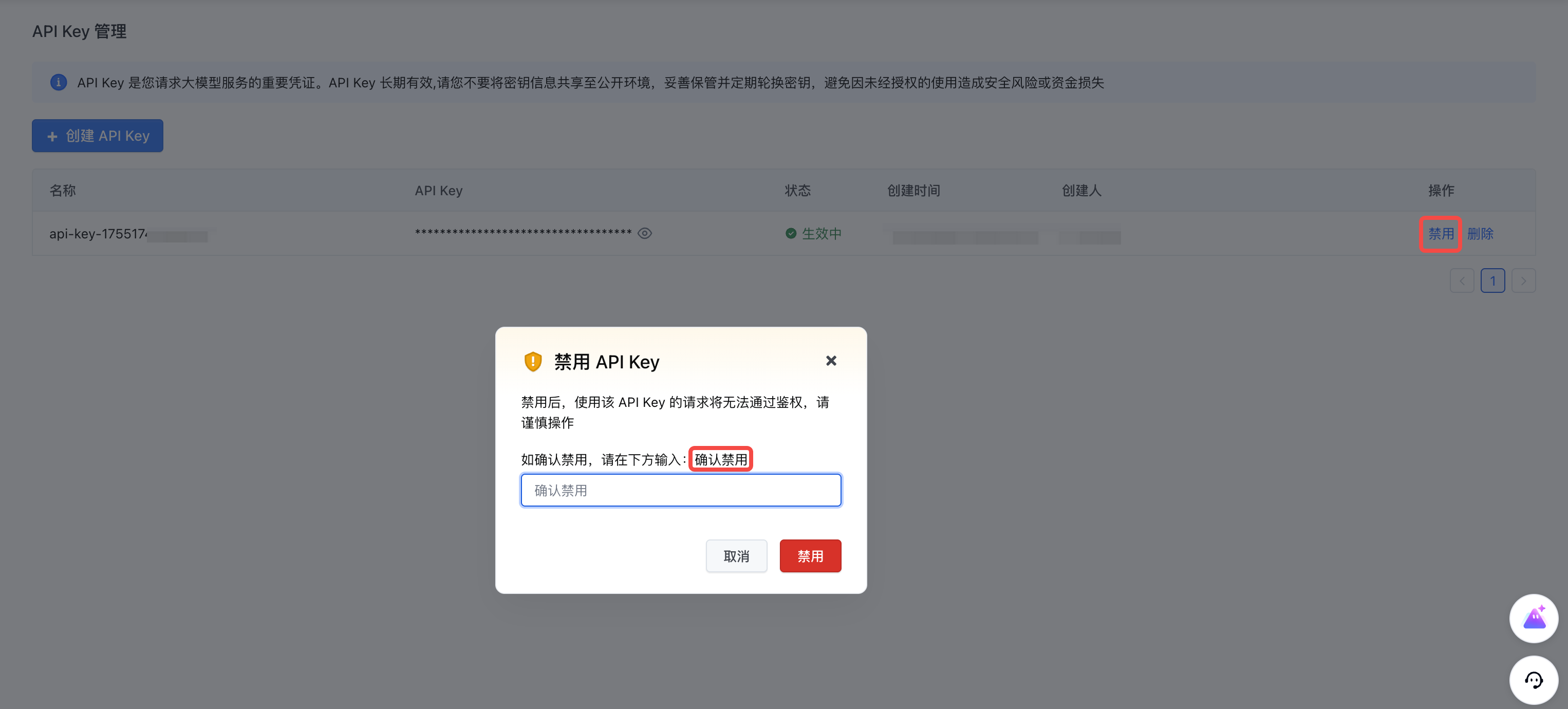 对于每个 API Key 实例,目前会展示名称、API Key、状态、创建时间、创建人等信息,与禁用/删除两种操作。