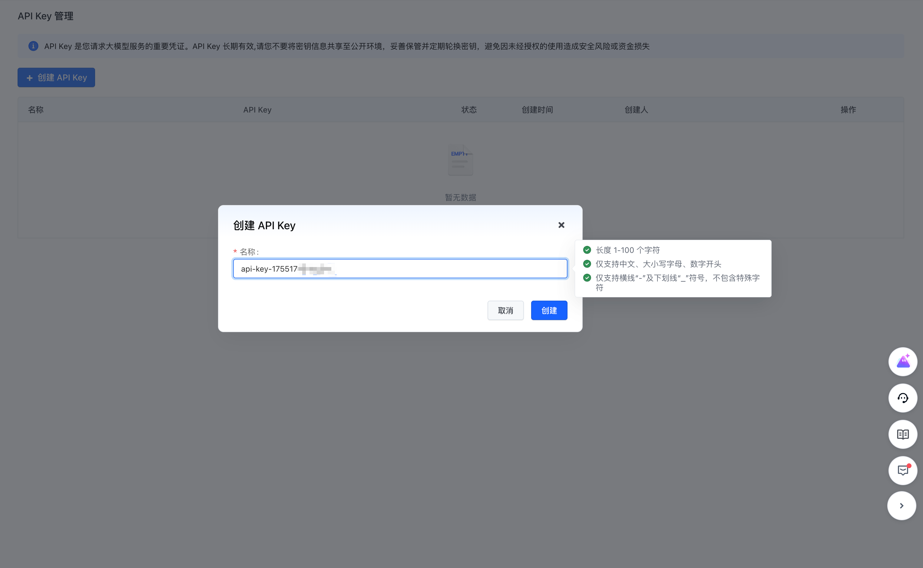 api-key-{当前时间戳}的既定格式生成一个默认名称,您也可以自定义自己的名称。说明