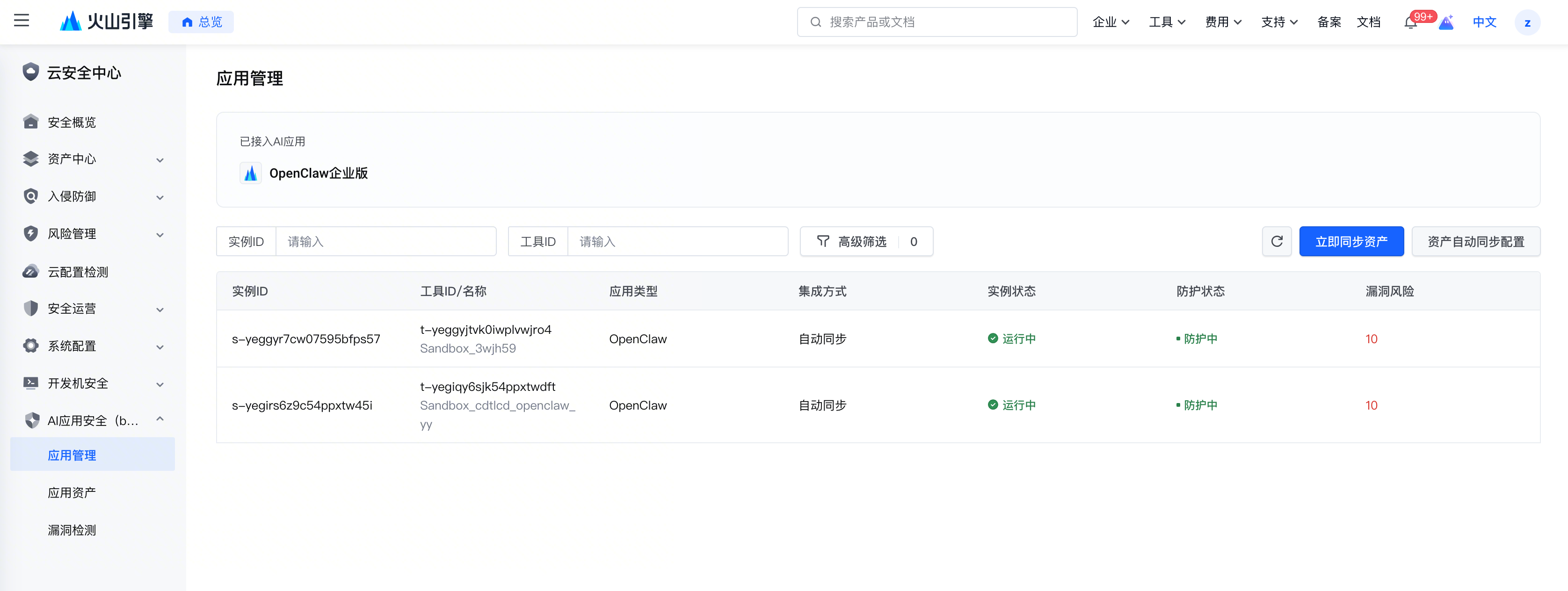 应用管理页面集中展示了所有已接入 AI 应用安全的实例信息,帮助你全面掌握各应用实例的运行状态、防护状态和潜在的安全风险,并进行统一管理。