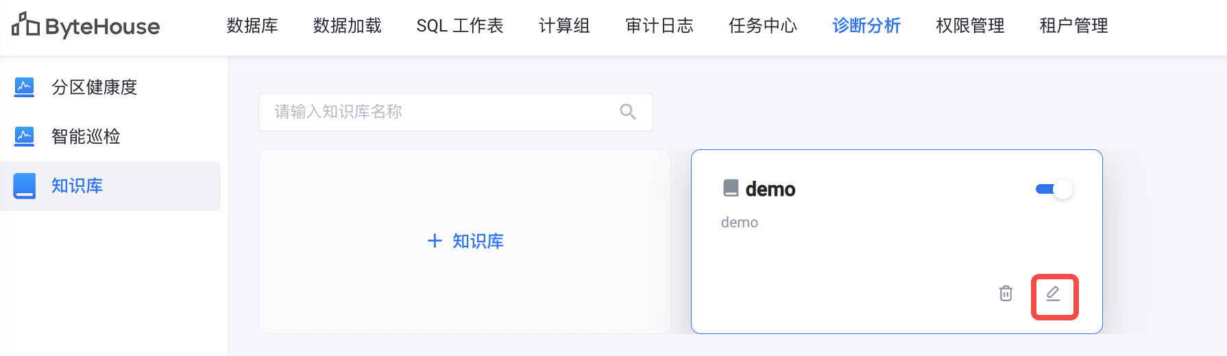 知识库创建完成后默认启用,智能助手将读取您创建的知识库,您可按需选择并关联知识库,帮助您更好地结合业务需求使用 ByteHouse。