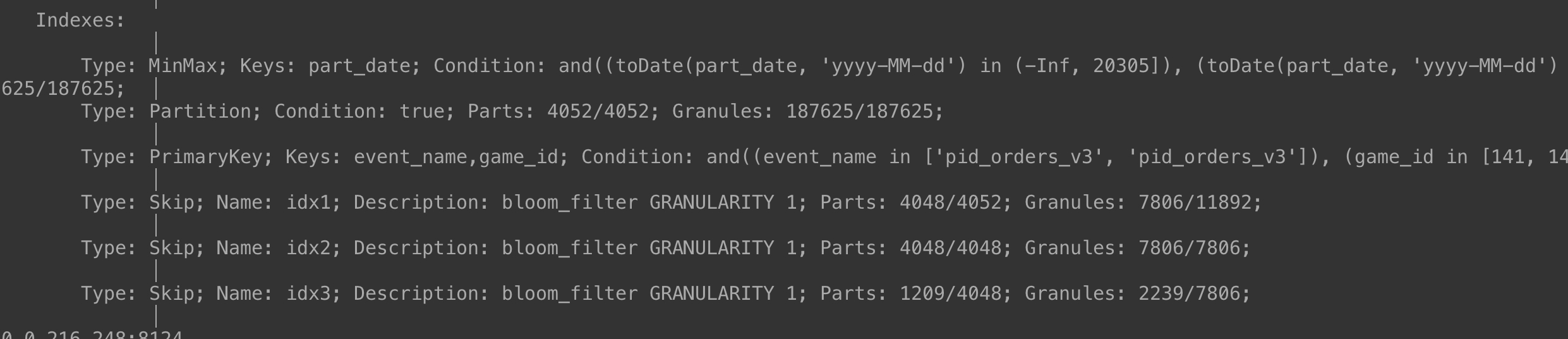 该示例使用值过滤条件,在分区过滤基础上引擎可以进一步通过 Part 分区键上的 minmax 信息,裁剪掉不必要的 Part。