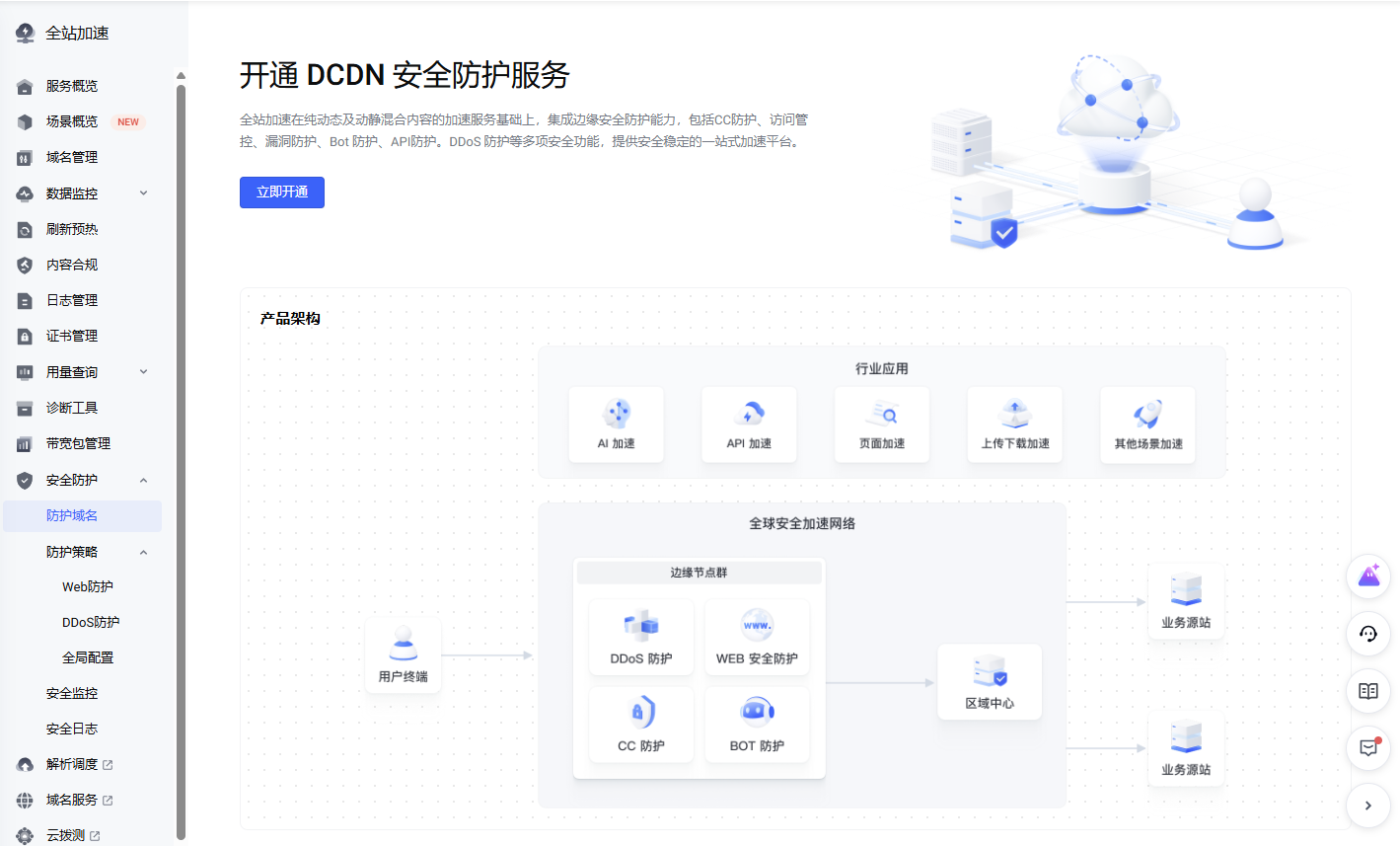 | DDoS防护 | 全站加速 DDoS 防护依托火山引擎边缘节点资源,加载自研清洗模块,精准抵御四层、七层 DDoS 流量攻击。 |