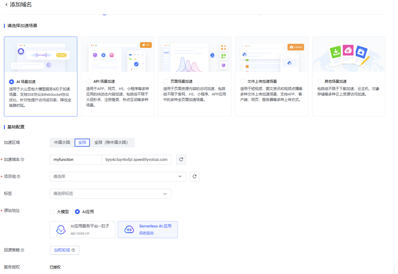 - 在 源站地址 选项中,选择 AI 应用,然后选择 Serverless AI 应用。