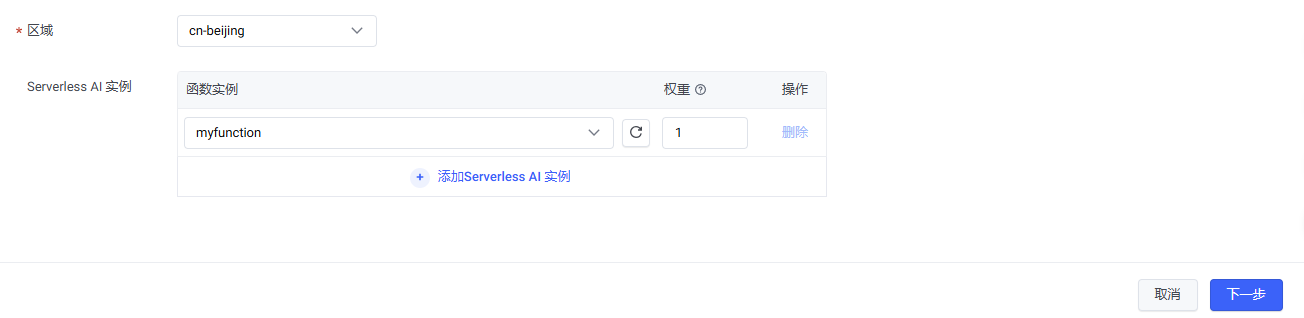 - 在 区域 列表中,选择函数所在的区域,然后点击 添加 Serverless AI 实例。